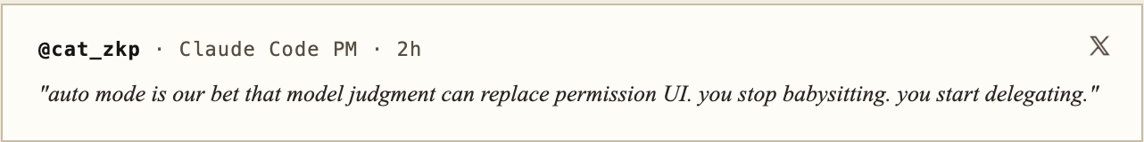 ALAN: 区别大了。skip 是你把保险栓拔了,出事你负责。auto 是模型自己装了一套保险——危险操作它主动停下问你,低风险自己处理。本质是把 "permission UI" 这一整层,从产品外壳挪到了模型权重里。