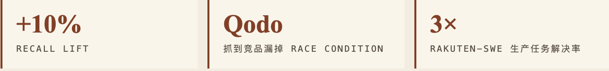 CodeRabbit 的 David Loker 给的数字更直接:recall 涨 10% 以上,在最复杂的 PR 里面挖出最难抓的 bug,precision 几乎没掉。recall 涨、precision 不掉——code review 领域里,这就是 holy grail,上一个拿到这个组合的叫 Google 内部的 Tricorder,做了十年。