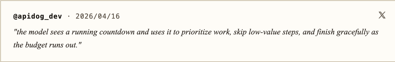 Task budget 的设计非常巧妙——不是简单的 token 上限,而是 让模型自己看到预算在倒数,自己决定跳过哪些步骤、怎么把活儿做到最关键的完成度。
