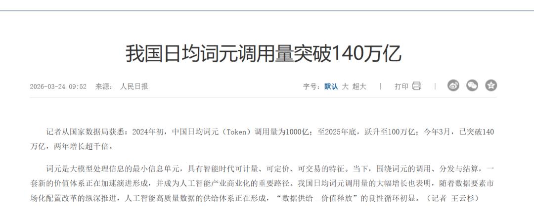 国家数据局数据印证了这一爆发:我国日均 Token 调用量从 2024 年初的 1000 亿飙升至 2026年 3 月的 140 万亿,两年增长超 1000 倍,仅 2026 年第一季度就较 2025 年底增长 40%。