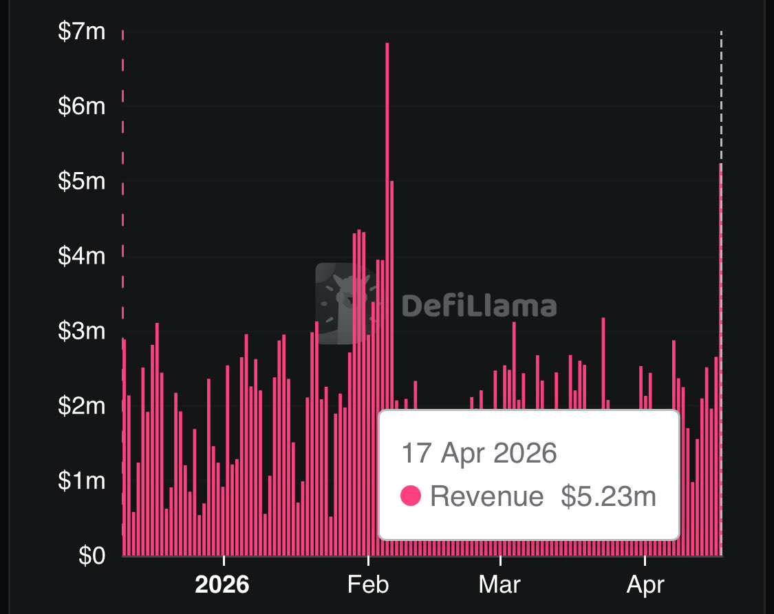PANews 4月18日消息,据 Defillama 数据显示,Hyperliquid 日收入自 2 月初以来首次突破 500 万美元。