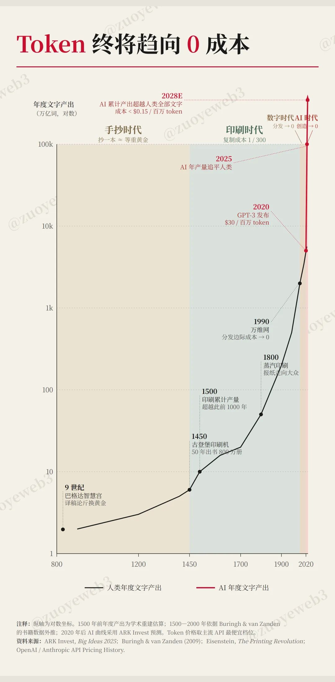 以中国为例, Token 调用量从 2024 年 1000 亿/日 –> 2025 年底 100 万亿/日 –>现在 140 万亿/日,内容和数据的生产即将进入零成本时代。