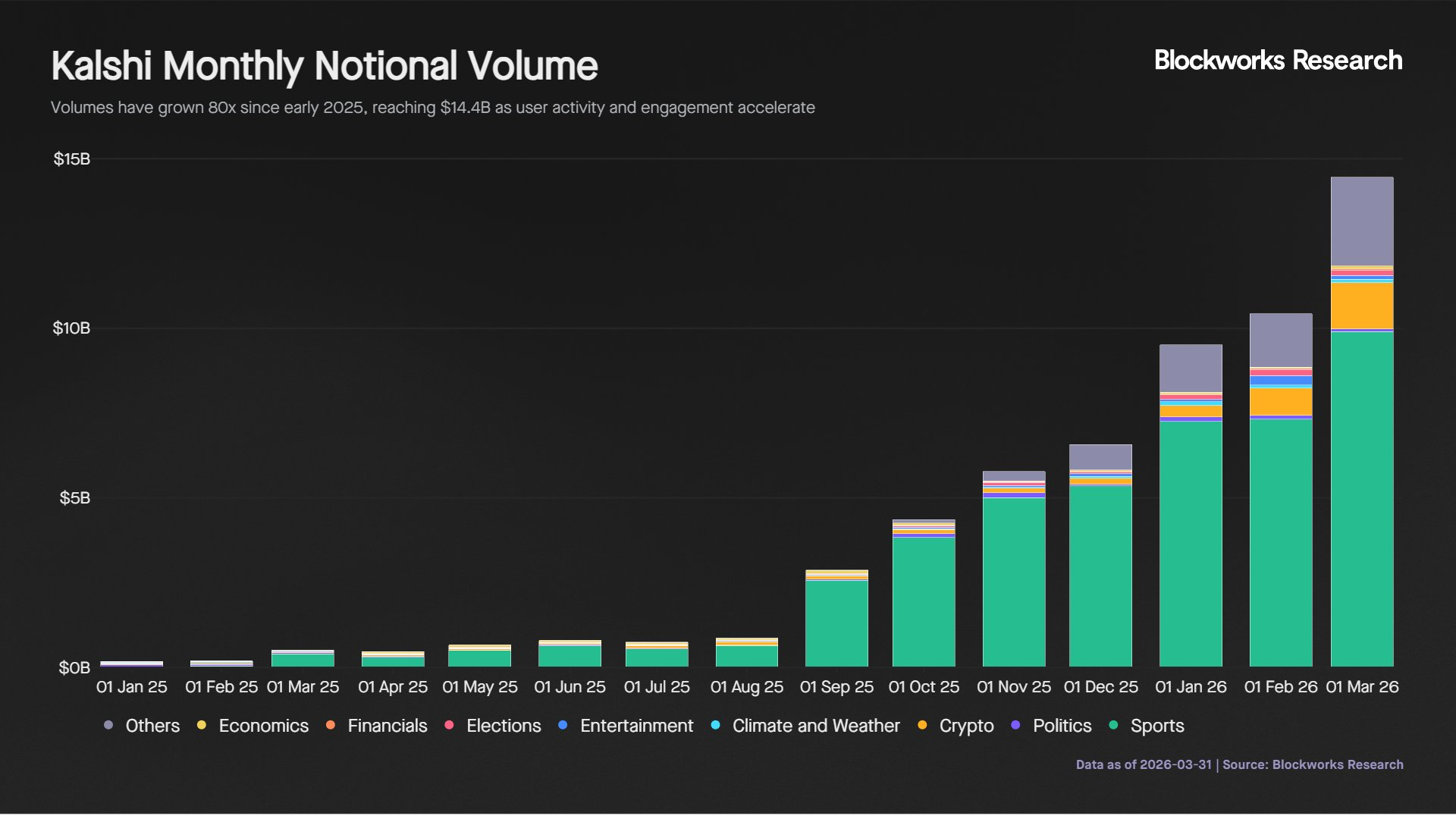 Kalshi 过去一年经历了快速增长,月度名义交易总量从 2025 年初的 1.8 亿美元增长了 80 倍,达到 2026 年 3 月的 144 亿美元。月均交易量增长率达 40%,反映出用户参与度的提高以及交易活跃度的提升。