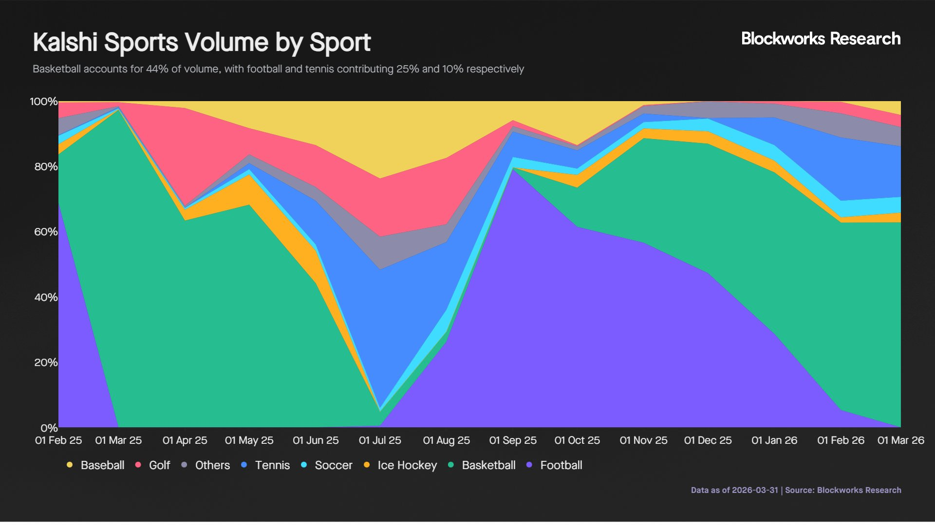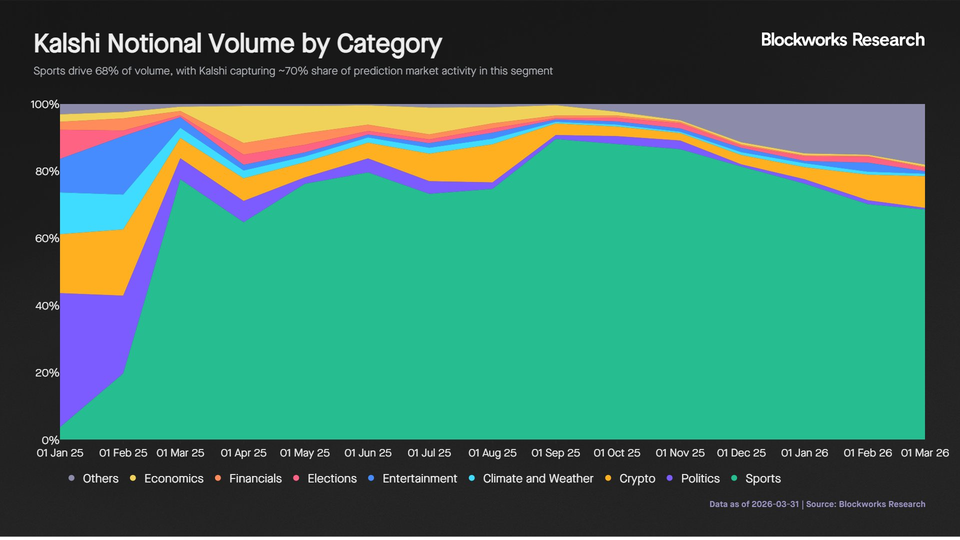 体育市场一直是推动这一增长的主要动力,目前占总交易量的 68%。体育领域的交易量从 2025 年 7 月的 5.4 亿美元增长到 2026 年 3 月的 99 亿美元,三个季度内增长了 18 倍。Kalshi 在该领域占据了稳固的地位,约占体育预测市场交易量的 70%。