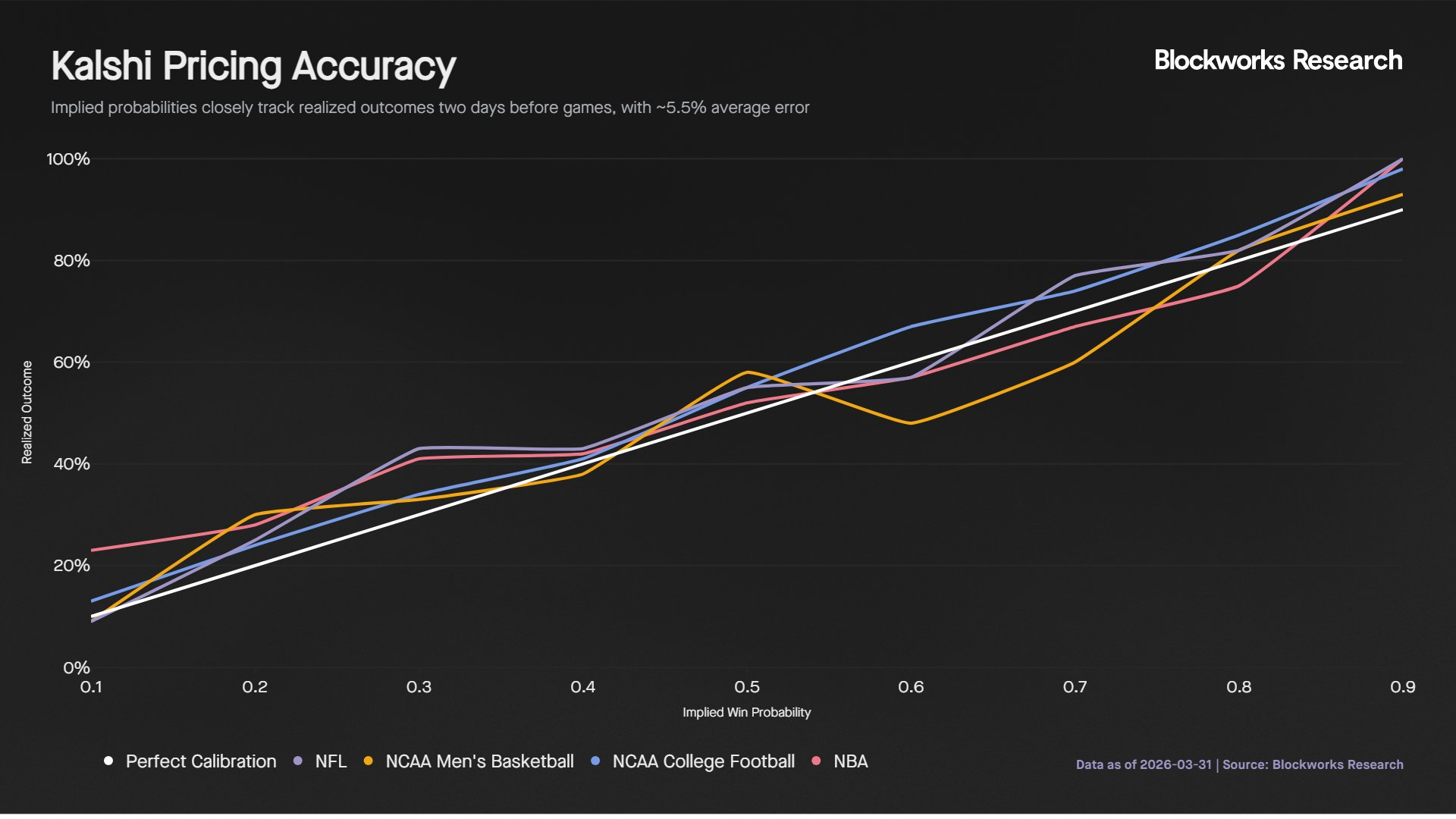 比赛开始前两天,Kalshi 价格是预测比赛结果的有力指标。平均而言,隐含概率与实际结果的偏差为 5.5 个百分点。在分析的四个联赛中,NCAA 大学橄榄球的预测准确率最高。