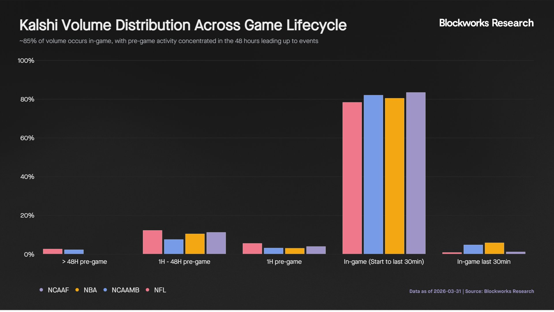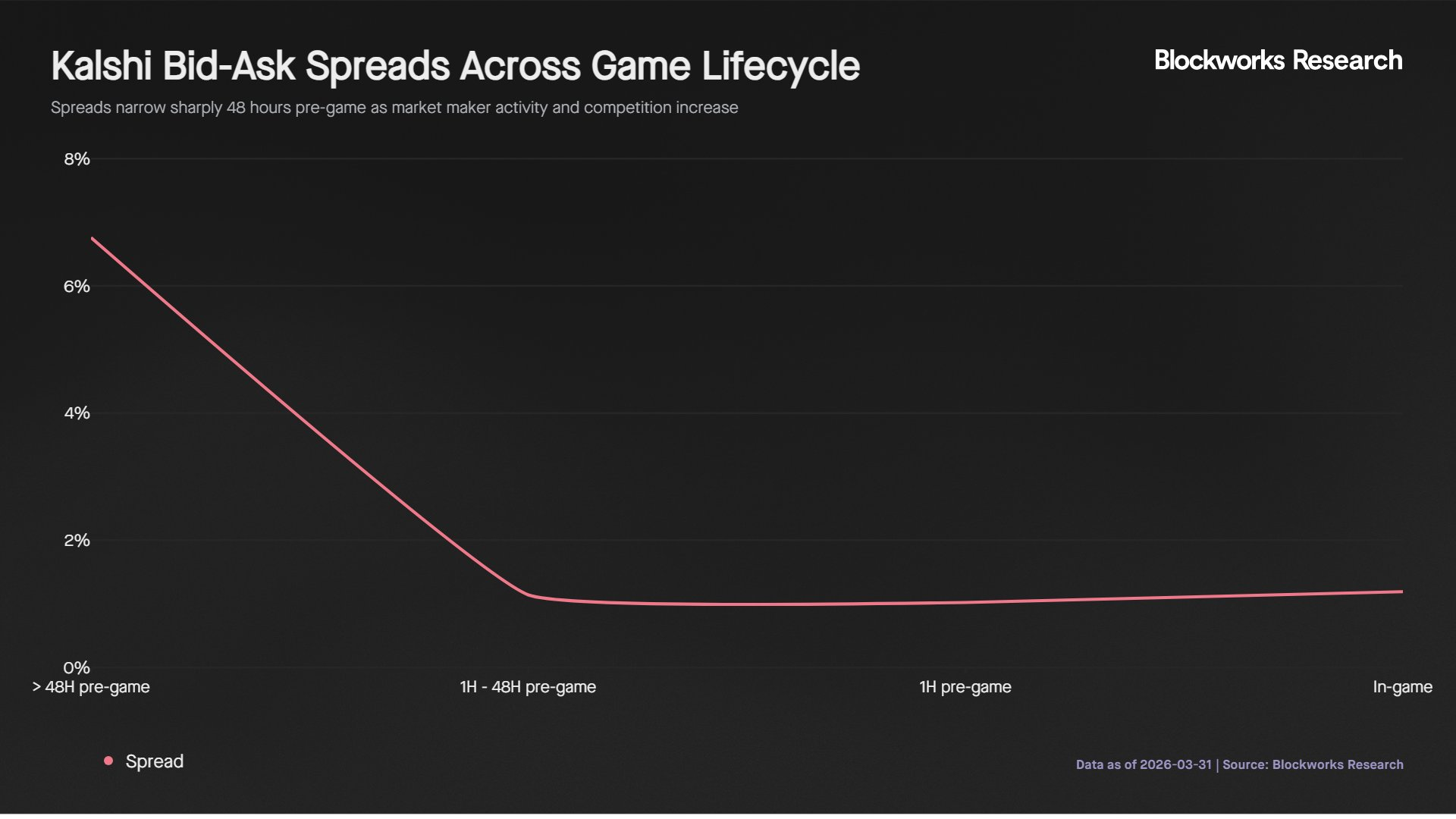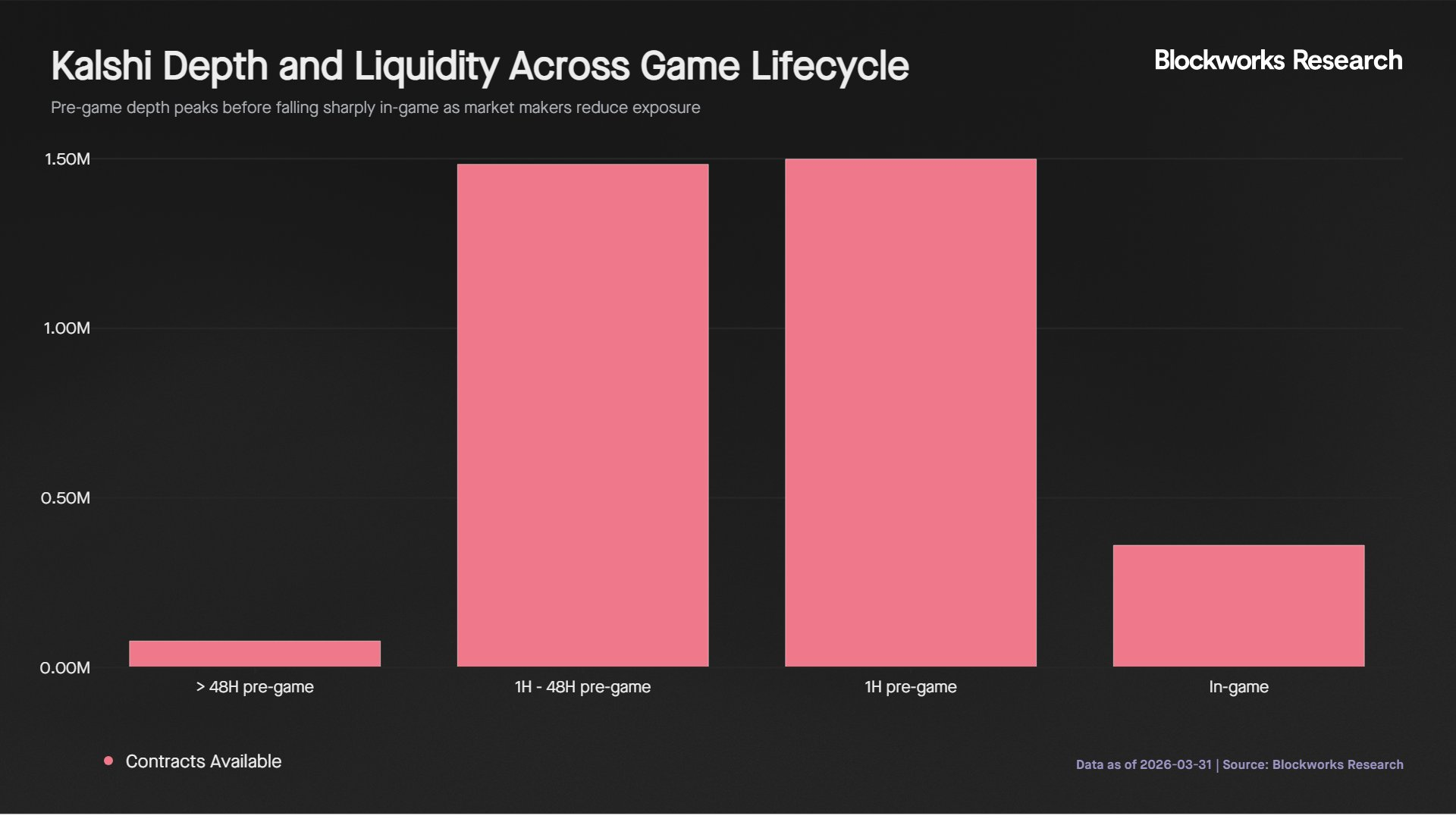 这些较高的成本,加上更稀薄的赛中流动性,意味着规模更大、更成熟的博彩玩家可能会继续偏好传统博彩公司,因为那里的定价通常可以协商,且大额交易的执行效率更高。为了提高竞争力,Kalshi 需降低费用并加强流动性激励措施,尤其是在赛中交易期间,此时交易活动较高,但深度却在下降。