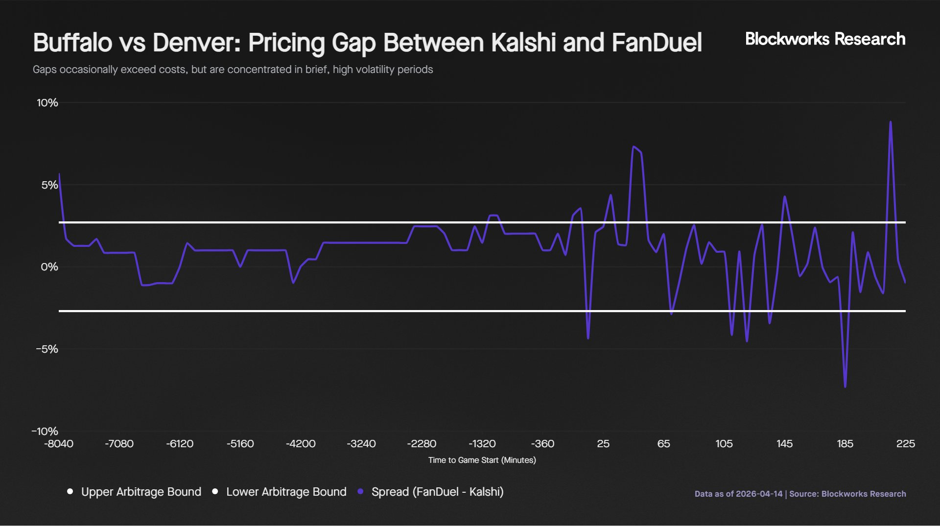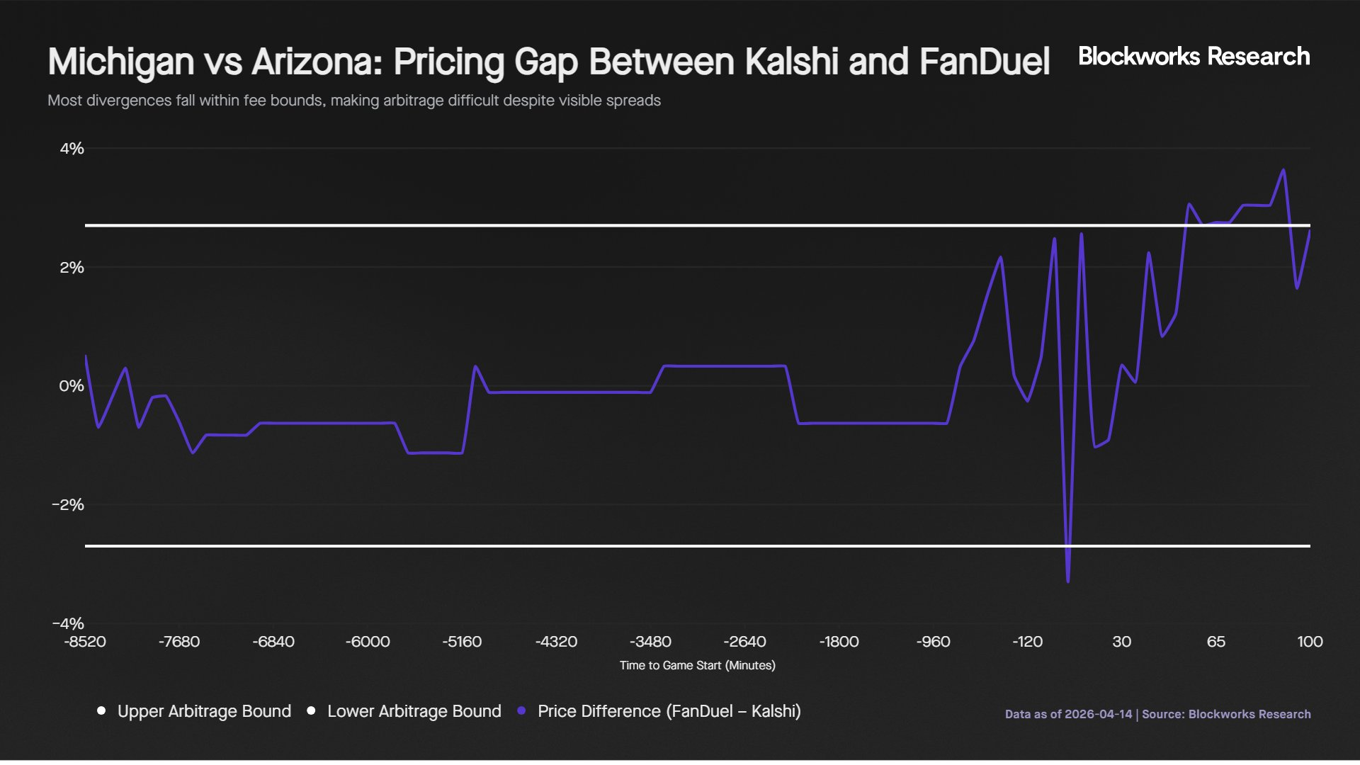 值得注意的是,下半场的价格差异具有方向性,随着密歇根扩大领先优势,FanDuel 对亚利桑那的定价始终高于 Kalshi。这表明,在比赛势头强劲的阶段,Kalshi 能更快地整合比赛内信息。