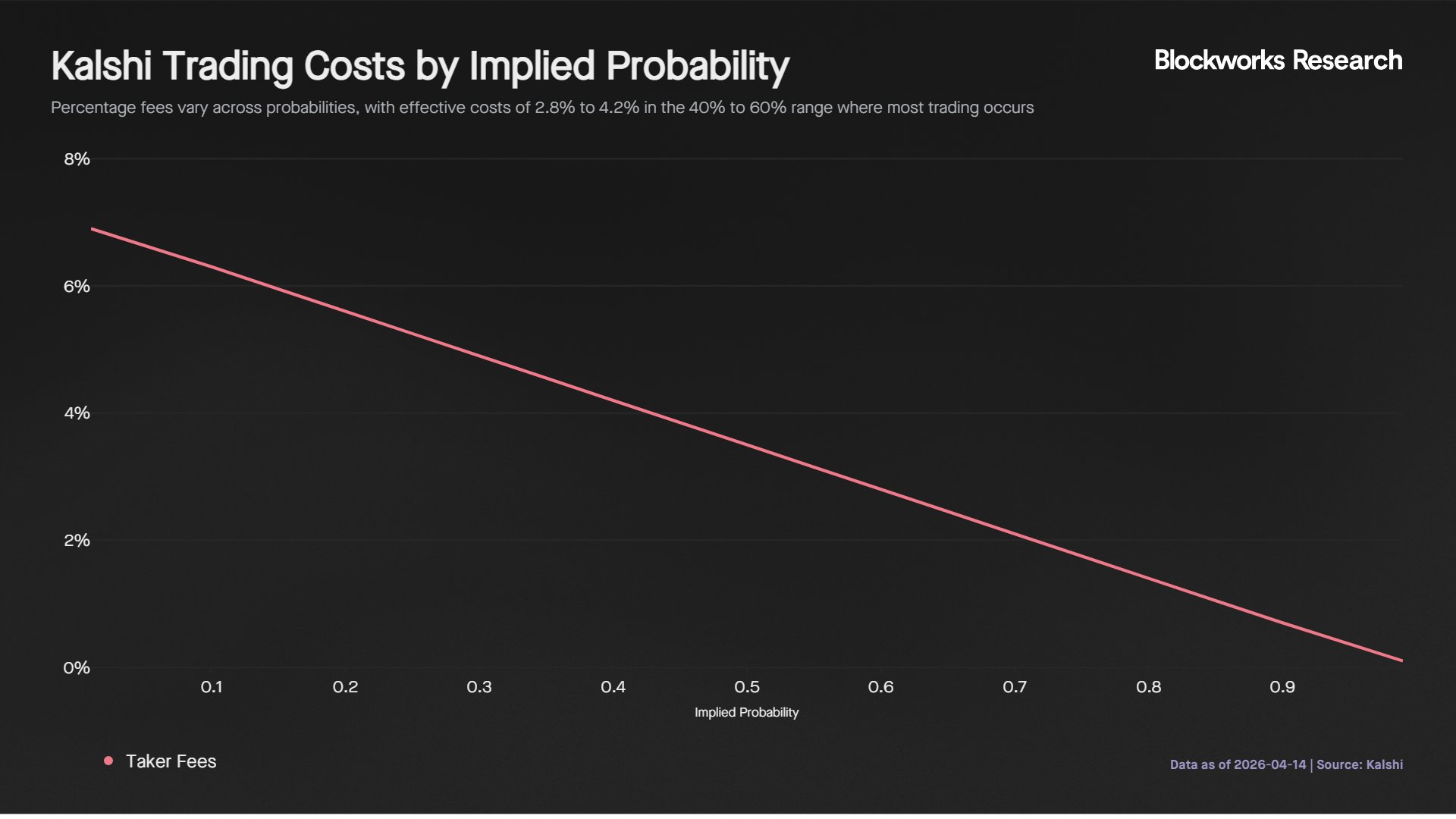 FanDuel 的赔率已扣除佣金,佣金相当于每方约 2% 的入场成本。在 Kalshi 平台上,手续费会根据合约概率而变化,在 50% 左右的概率水平上绝对值最高,对于吃单者而言,手续费约为 3.50%,对于挂单者而言,手续费约为 0.88%。由于大多数场内交易发生在 40% 到 60% 的概率范围内,Kalshi 平台的实际交易成本在 2.8% 到 4.2% 之间,与传统体育博彩平台相比,其成本相当,甚至在某些情况下更高,尤其对于吃单者而言。