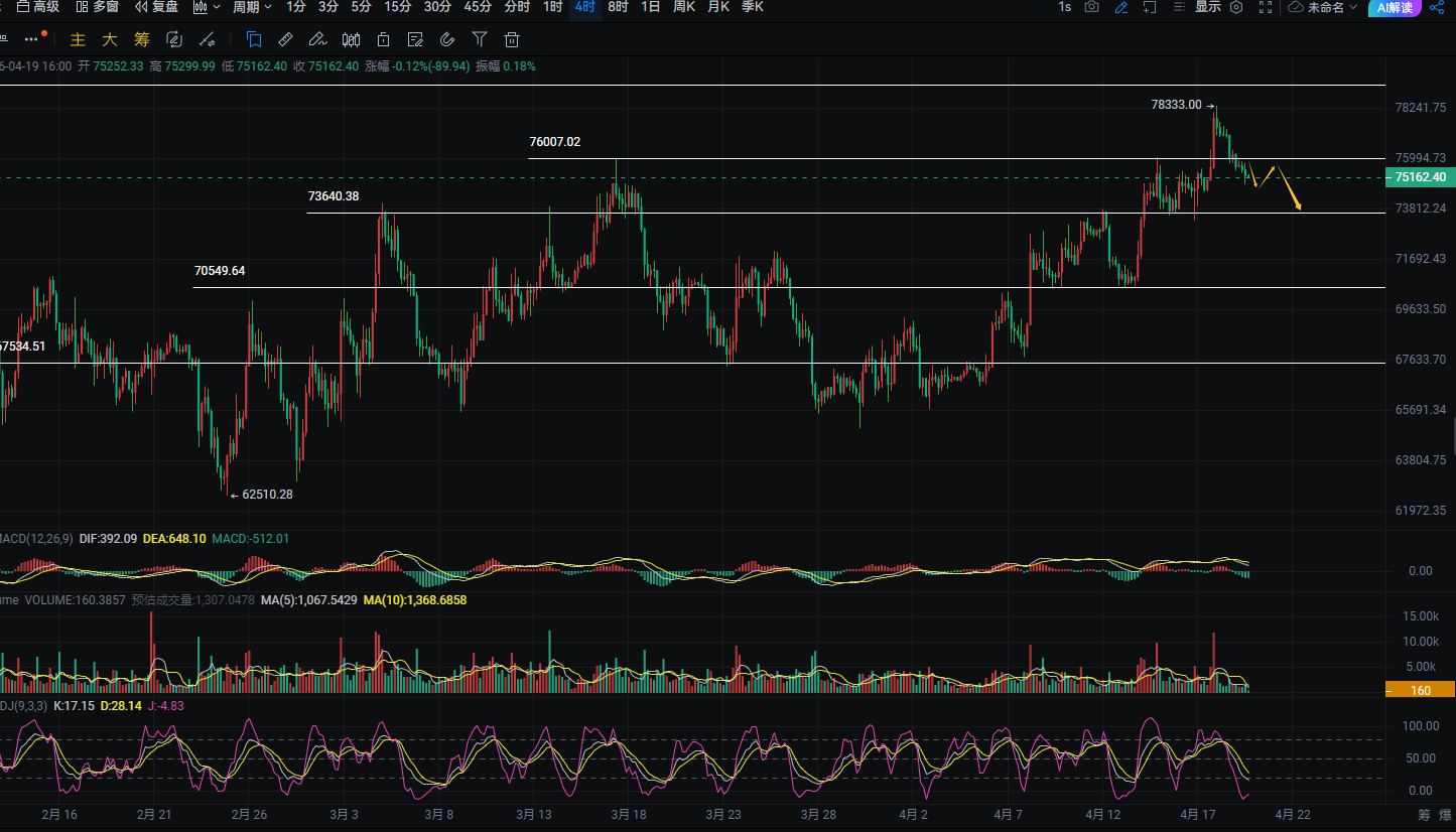 基本上做空很少有被套很久的,有史以来空被套总是比多被套更好解一些,因为币圈下跌总是比上涨要快且丝滑。这波冲高回落之后,现在已经从78300跌落到75500下方平稳休整了,大多头趋势出现了转折。不过日线整体依旧强势,均线还是多头托底,MACD保持多头动能,之前高位超买也消化完毕了,走势变得健康很多。现在下方74000-73000是强力支撑防线,上方第一压力在76000,其次第二压力位是77600。4小时目前在区间内震荡换手,上涨动能慢慢放缓,属于涨完正常蓄力调整,价格依托布林中轨运行,整体偏稳。1小时盘面缩量横盘,多空暂时僵持住了,没有明显单边行情。下方一旦跌破74500,就会往下测试73500一带。有76000上方的空在手的,可以75000这里分批出掉一部分,留剩余部分再继续下看强弱即可。