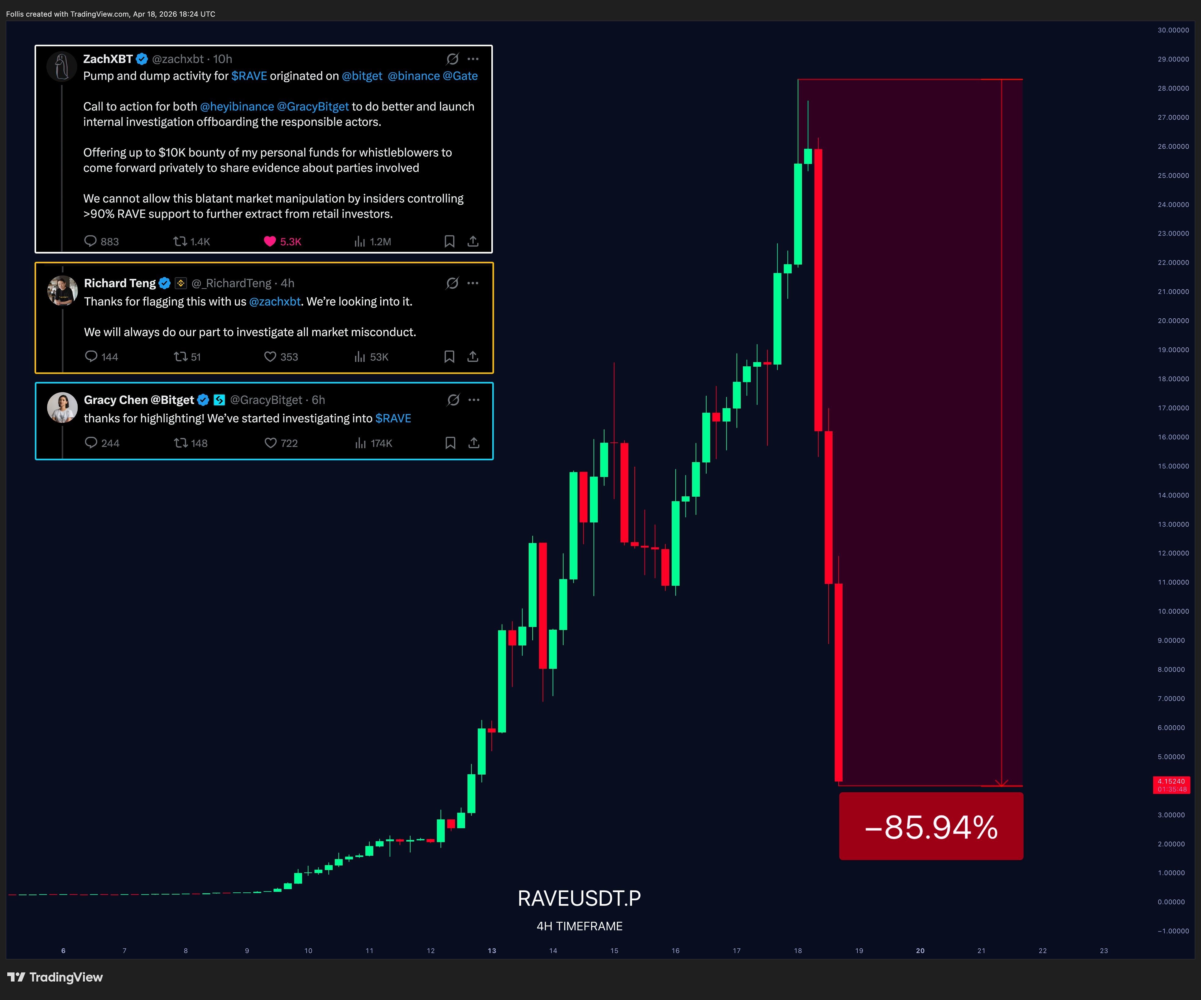 ZachXBT明确指出与特定场所相关的协调性拉升和抛售活动,声称内部人士控制了超过90%的RAVE供应。他甚至提供了个人$10,000的悬赏给揭发者,鼓励他们提供证据。