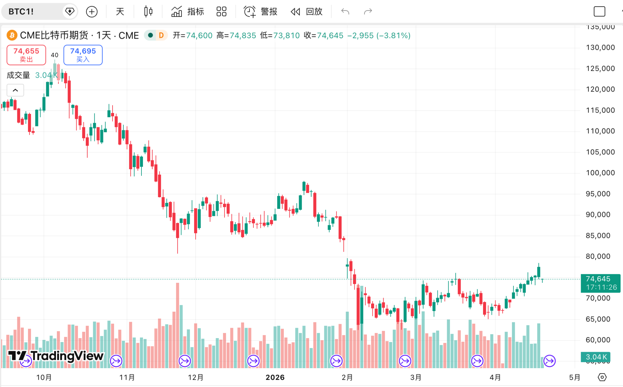 随着伊朗拒绝第二轮和谈及霍尔木兹海峡的封锁,比特币从78,400美元的十周高点迅速回落至74,000美元至75,000美元附近。值得注意的是,尽管价格波动剧烈,但30天波动率指数仅为1.75%,Galaxy研究主管Alex Thorn指出,本轮周期(最高涨幅97%)的波动性和上涨空间较以往三次减半周期“戏剧性”地减弱。目前,CME在77.3K和67.2K留下的两个巨大缺口,正在强烈影响短期价格走势。