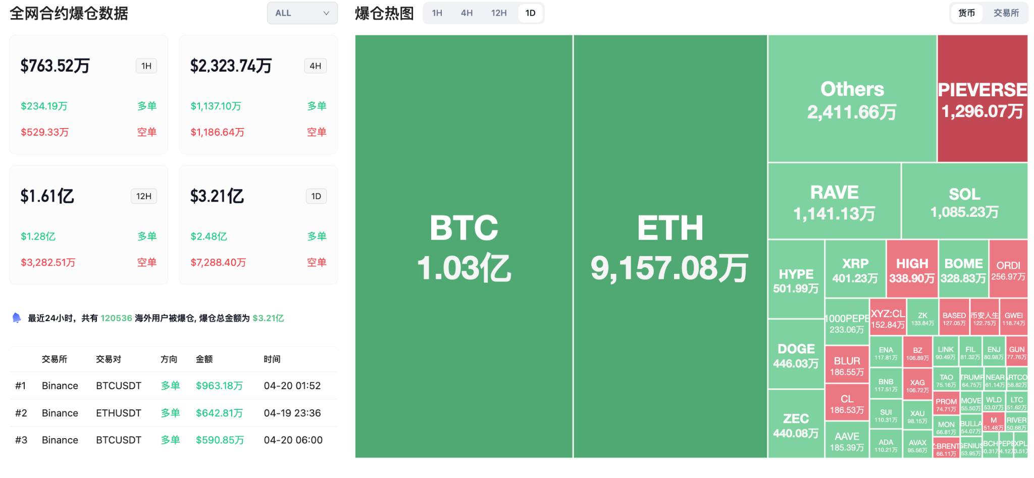 24小时爆仓数据:全球共120536人被爆仓,爆仓总金额为3.21亿美元,其中BTC爆仓1.03亿美元、ETH爆仓9157万美元、RAVE爆仓1141万美元。