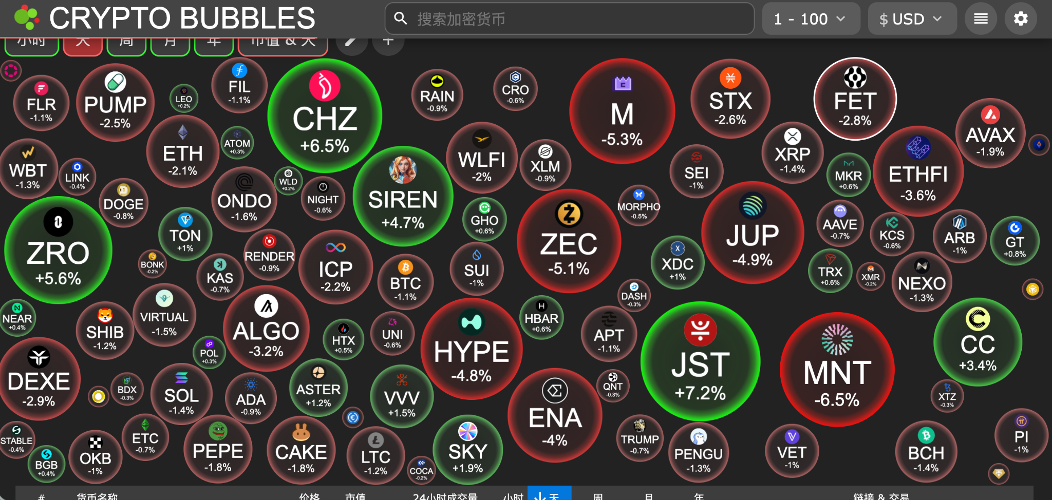 今日市值前100币种最大涨幅:JUST 涨 7.2%、Chiliz 涨 6.5%、LayerZero 涨 5.7%、Siren 涨 4.8%、Canton Network 涨 3.4%。