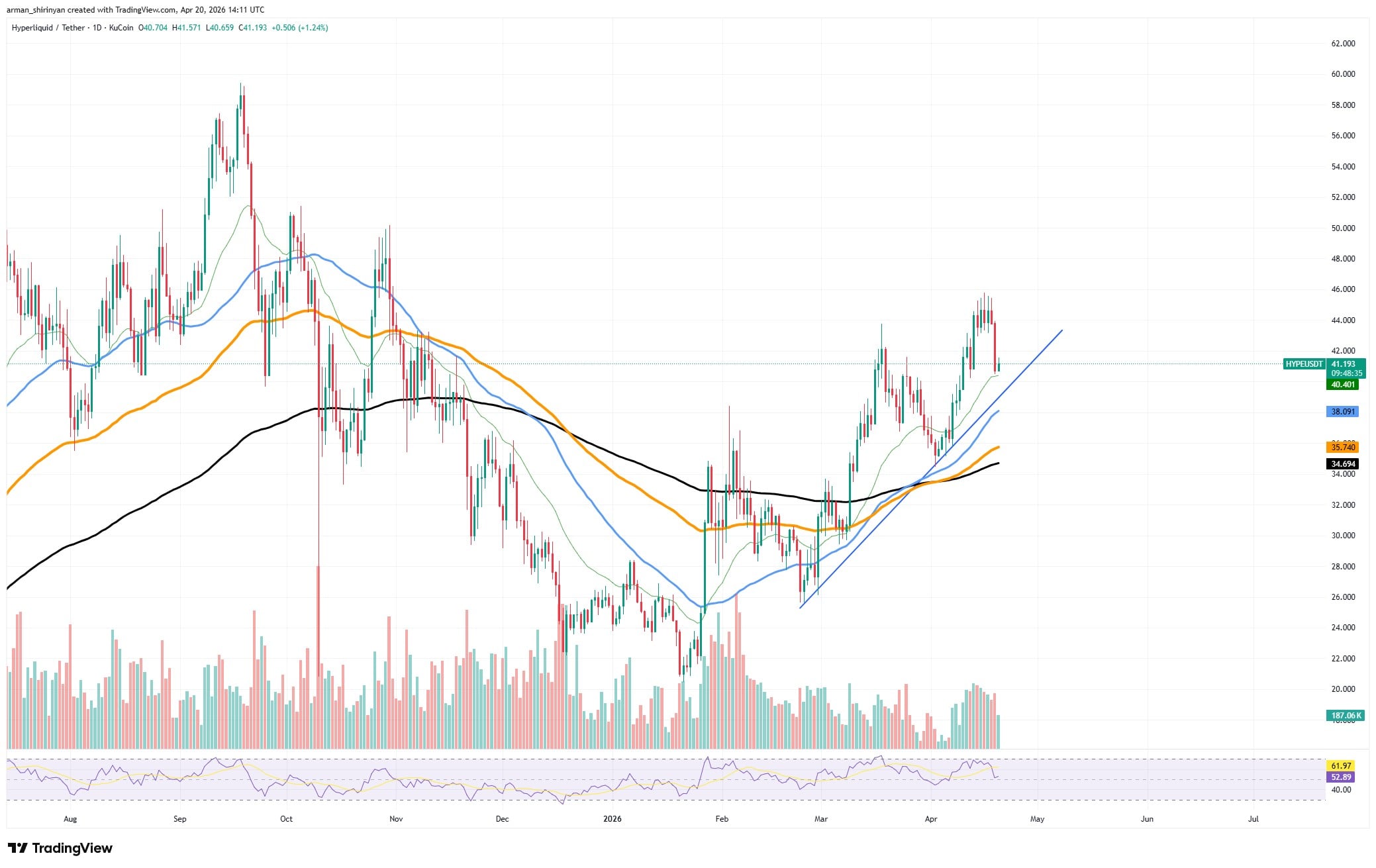 从技术上讲,HYPE已经从之前的修正阶段转向明显的恢复结构。在上升趋势线的帮助下,图表显示出自三月以来形成的一系列更高的低点。短期移动平均线已被价格重新夺回,当前努力保持在其之上,这通常表示买方持久存在。