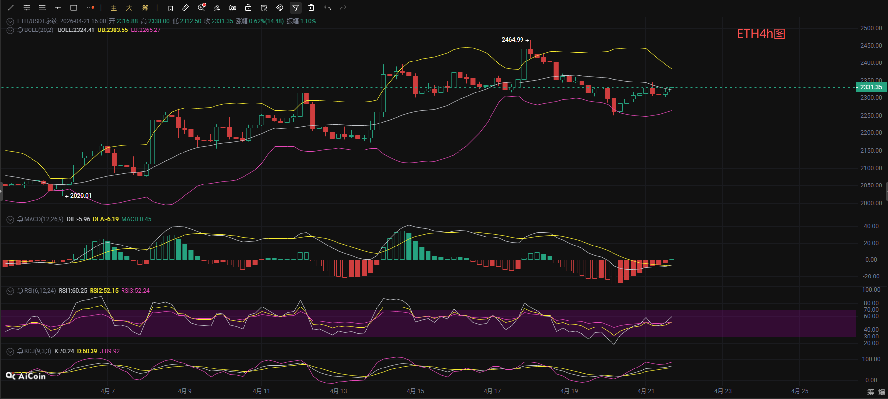 从短周期小时图观察,4小时级别处于回调后的企稳阶段,价格在布林带中轨附近窄幅整理,布林带上下轨收窄,震荡区间压缩至2264-2382。EMA均线系统从下跌后的拐头走平,当前价格虽在短期均线上方但并未站稳,MACD由负转正,DIF与DEA在零轴下方有形成金叉的迹象,空头动能基本释放完毕,短线多头开始尝试反攻。RSI、KDJ指标从低位拐头向上,KDJ的J线已进入超买区间边缘,显示短线反弹动能正在累积,上方首要压力为2380附近,若突破则有望重回日线级别上升通道,反之则可能再次下探2250的阶段低点。操作上建议依托支撑与压力位高抛低吸,严格做好止盈止损,切勿追涨杀跌。