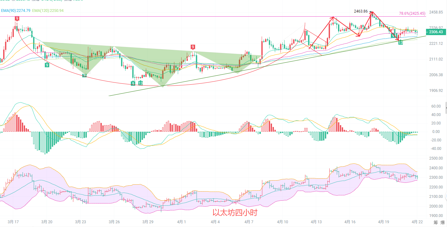 四小时K线在2300附近横盘震荡,EMA15、EMA30走平,多空力量趋于平衡。MACD绿柱小幅放大,短期回调信号出现,布林带中轨2310附近形成压制,下轨2270附近有支撑。前面从1936到2463的上涨,量能逐步衰减,高位抛压明显,现在的震荡属于上涨后的休整,没有新的增量资金进场,多头很难直接拉破前高,