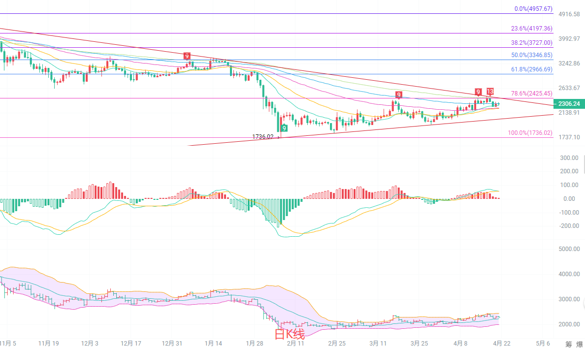 日K线维持在EMA15、EMA30上方,均线多头排列尚未被破坏,说明中期趋势仍偏多。但MACD红柱持续缩量,多头动能明显减弱,布林带持续收口,价格在中轨附近反复试探,区间在2200-2400之间。从低点1736的反弹,目前处于高位震荡阶段,没有放量突破前高,也没有跌破关键支撑,短期进入方向选择期。
