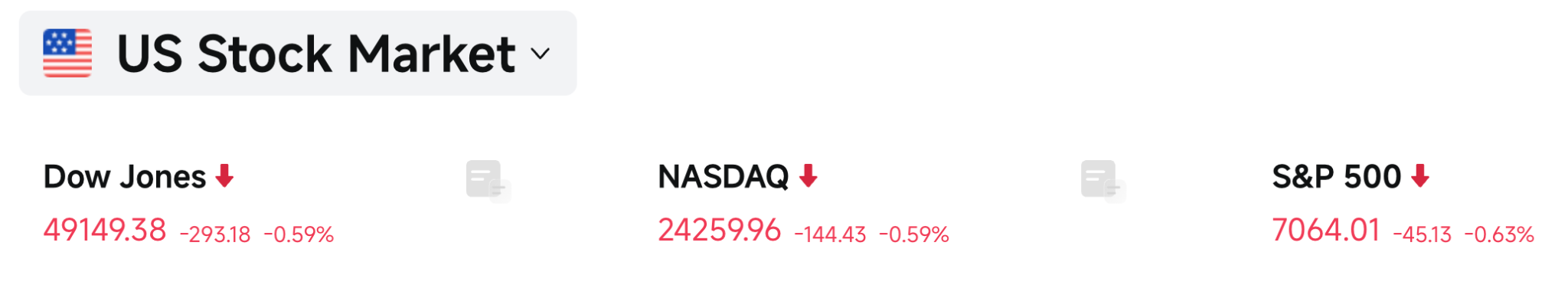 美股三大指数全线收跌,道琼斯工业指数下挫293.18点(-0.59%)至49,149.38点,标普500指数跌45.13点(-0.63%)收于7,064.01点,纳斯达克综合指数跌144.43点(-0.59%)至24,259.96点,结束了自1992年以来最长的13日连涨纪录。