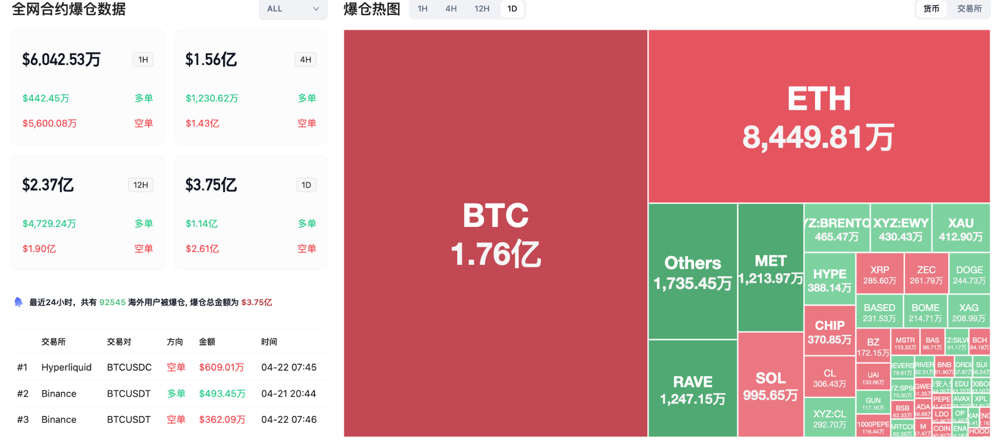 24小时爆仓数据:全球共92545人被爆仓,爆仓总金额为3.75亿美元,其中BTC爆仓1.76亿美元、ETH爆仓8449万美元、RAVE爆仓1247万美元。