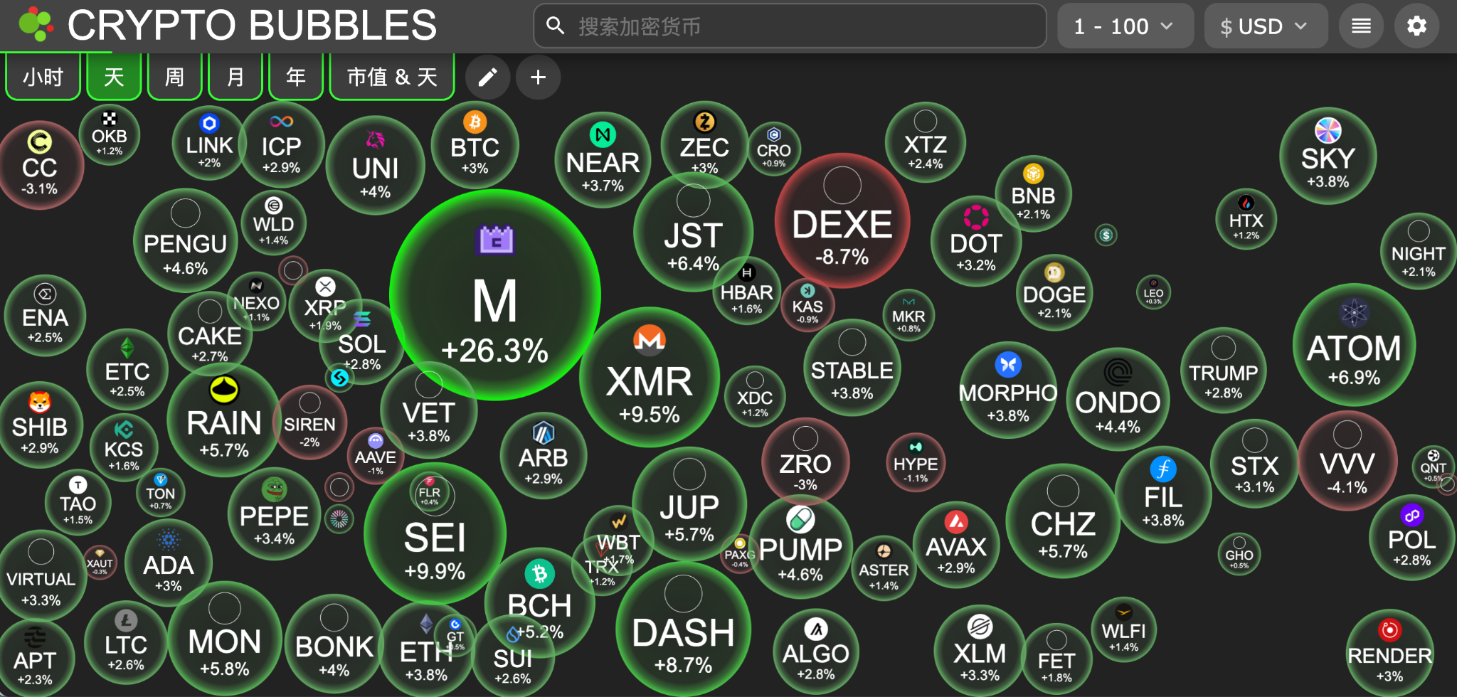 今日市值前100币种最大涨幅:MemeCore 涨 26.3%、Sei 涨 9.9%、Monero 涨 9.5%、Dash 涨 8.7%、Cosmos 涨 6.9%。