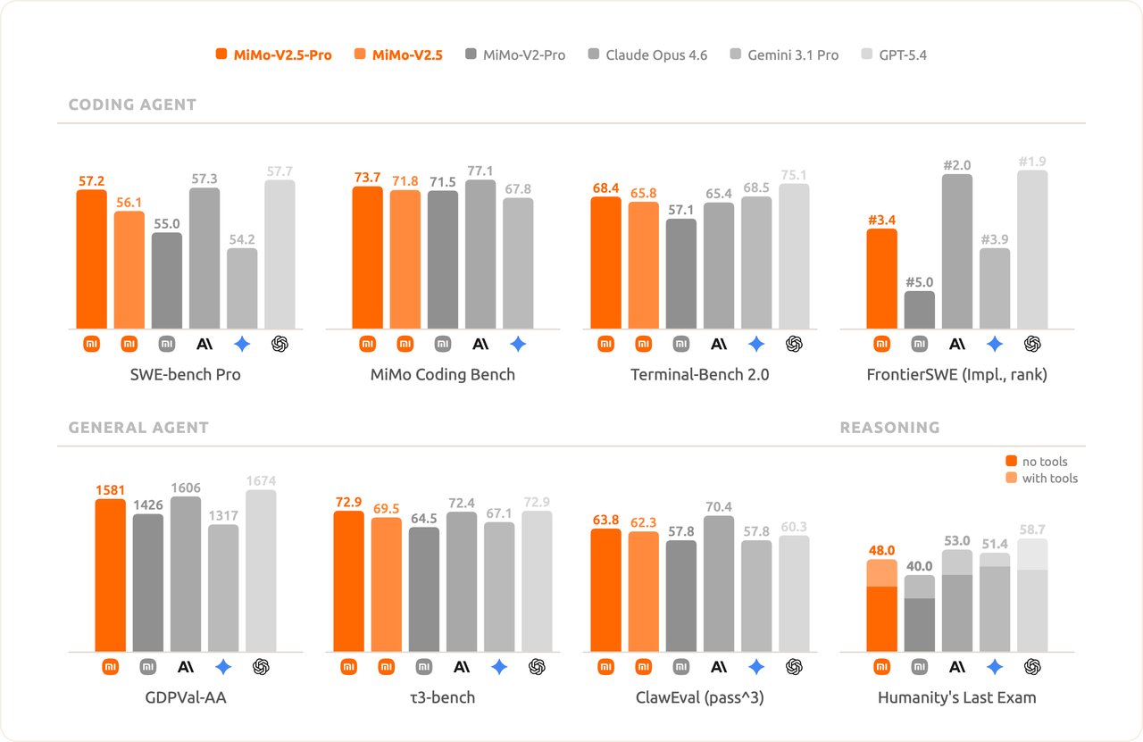 小米声称MiMo-V2.5-Pro代表了“在通用智能能力、复杂软件工程和长远任务上的重大飞跃”,并表示它现在在大多数编码和代理基准测试中能与前沿模型如Claude Opus 4.6和GPT-5.4相匹配。数字大体上支持这一观点——在更困难的推理任务上仍然可见一些差距。