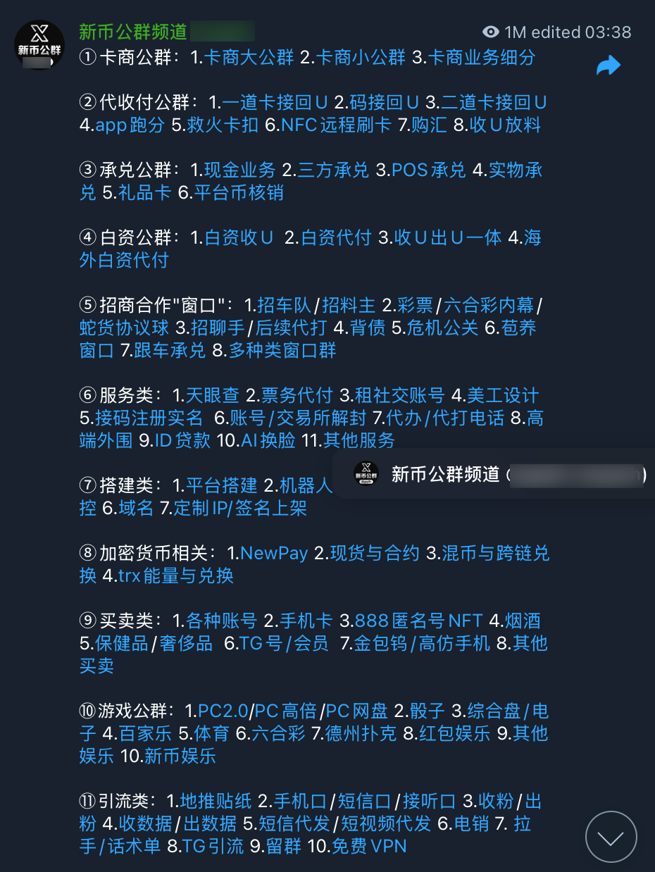 从新币披露的公群频道来看,其业务分布已经细化到了令人发指的程度。它不再是简单的资金担保,而是一个模块化的地下服务生态。根据最新业务分布图(图 2),新币将业务拆解为 11 大类,涵盖了非法产业链的每一个环节: