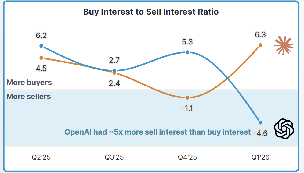 OpenAI的情况则有所不同。在Forge Global上,OpenAI的交易额为8800亿美元——仅比其2026年初融资轮中的8520亿美元估值高出3%。Caplight发现在第一季度,山姆·阿尔特曼的公司报告称,二级市场上对出售公司的兴趣多于购买。