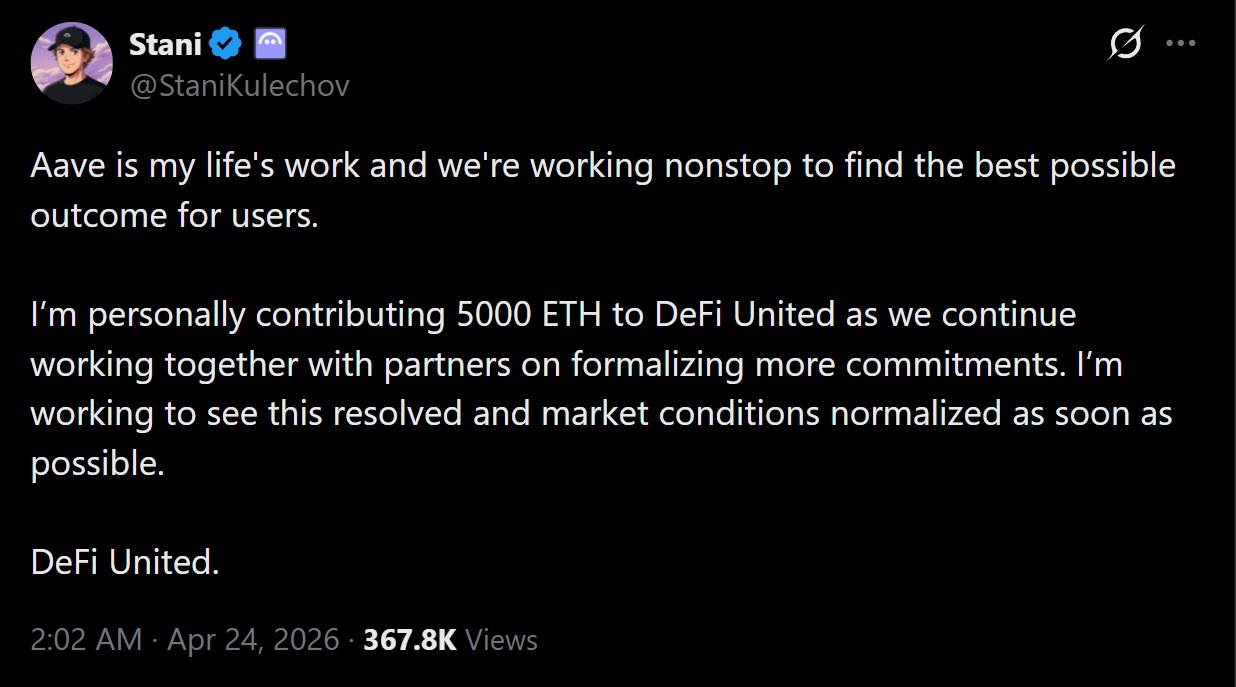 DeFi United 倡议代表了去中心化金融(DeFi)历史上最协调的跨协议响应之一。Kulechov 在 X 平台上对此做出了明确的公告,指出这些资金是他个人的,而不是 Aave 的国库资产。