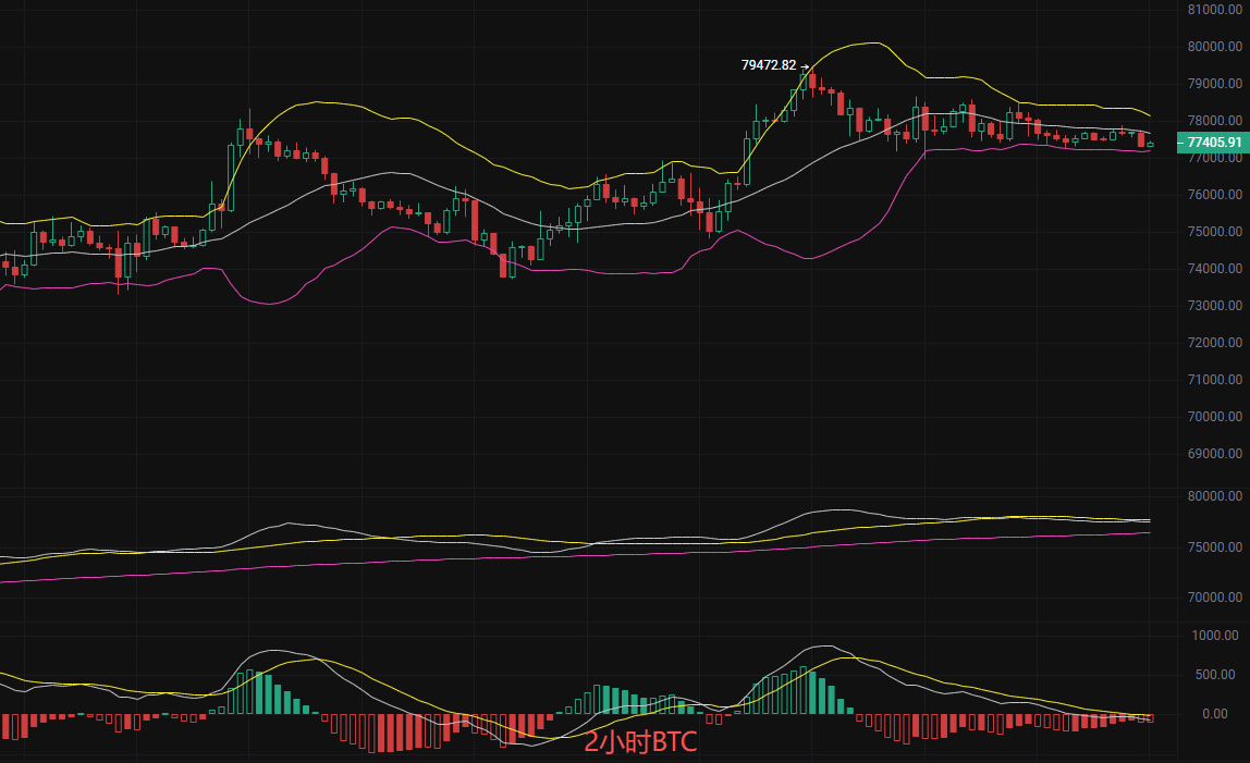 家人们!比特币现价77420,整体感觉像是在走钢丝,处于一个不上不下的微妙位置。前两天好不容易冲到了79472的历史高位,结果没能站稳,又被打了回来,现在就在77000到78000这个区间里来回晃荡。这说明多头虽然想往上冲,但上面抛压太重,一拉就被砸;空头也不敢轻易砸盘,怕下面有承接盘。整个市场就像被按了暂停键,多空双方都在观望,谁也不愿意先出手。这种行情最考验耐心,新手容易心浮气躁追涨杀跌,老手则在一旁静静等方向明朗。