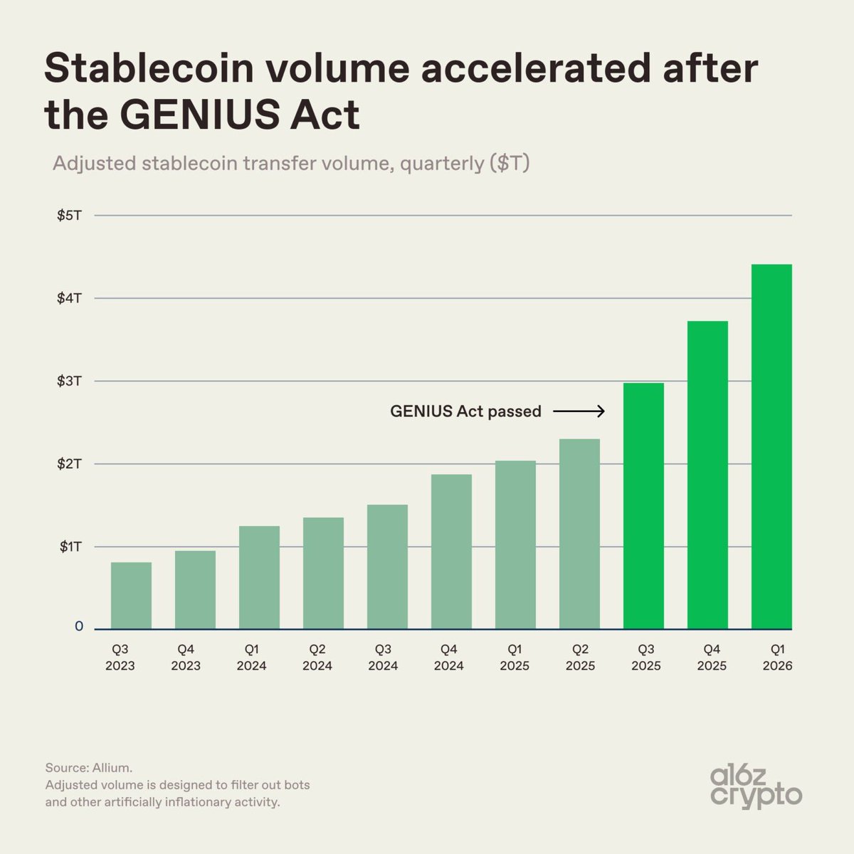 ⚡《GENIUS 法案》落地之后,稳定币交易量持续走高,2026 年第一季度交易量达到约 4.5 万亿美元!