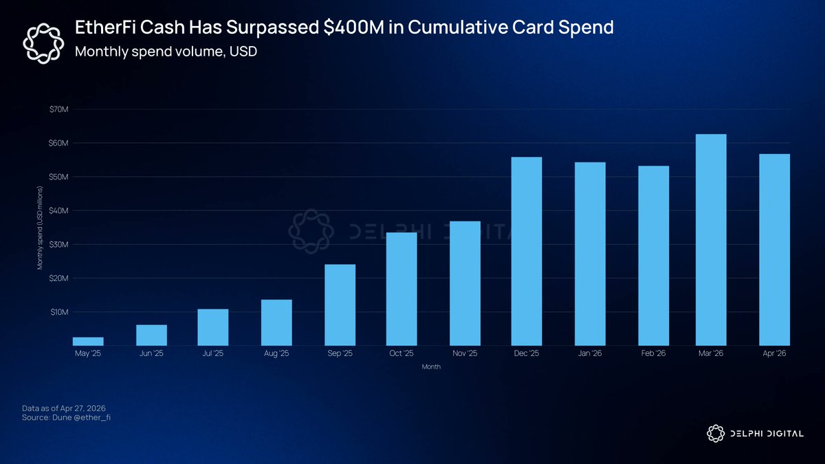 @ether_fi现金的累计支出超过4亿美元,自12月以来每月交易量保持在5000万美元以上。