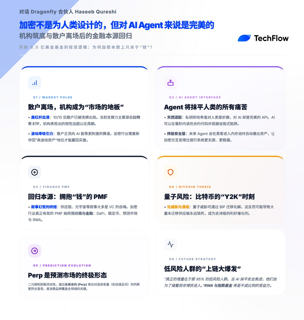 • “真正的潜力在于低风险偏好的人群。现在只有 5% 的低风险偏好者在链上。如果未来加密变得更安全,AI 智能体让一切变得极其简单,这些低风险偏好者将会大规模进入链上。”