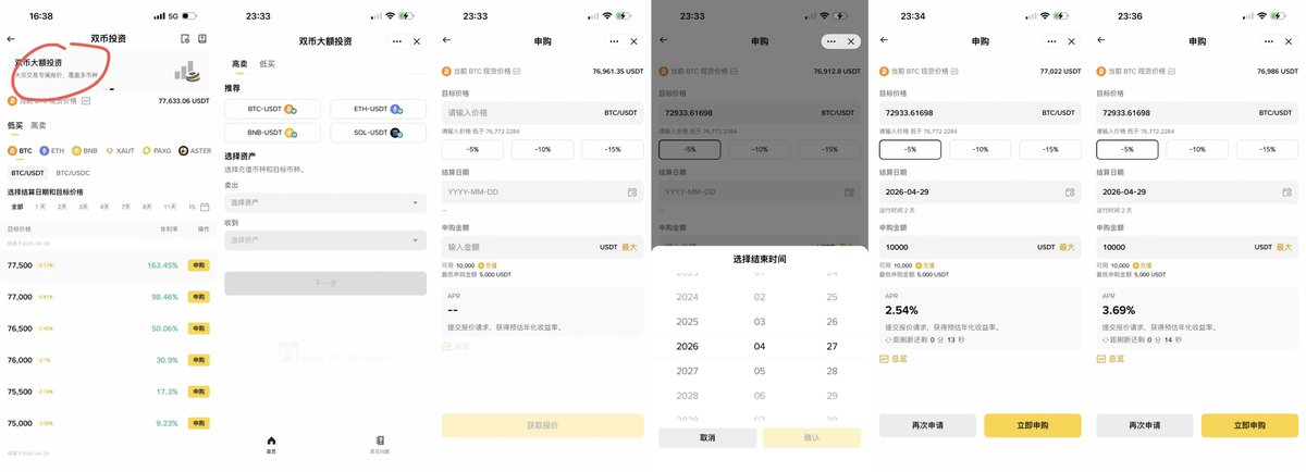 另外不得不说,在定制化双币理财方面 #Binance 是走在前边的,比如我现在在 Binance 买双币,都是在双币大额投资购买,虽然说是大额,但只要购买资金超过 5,000 USDT 就可以。