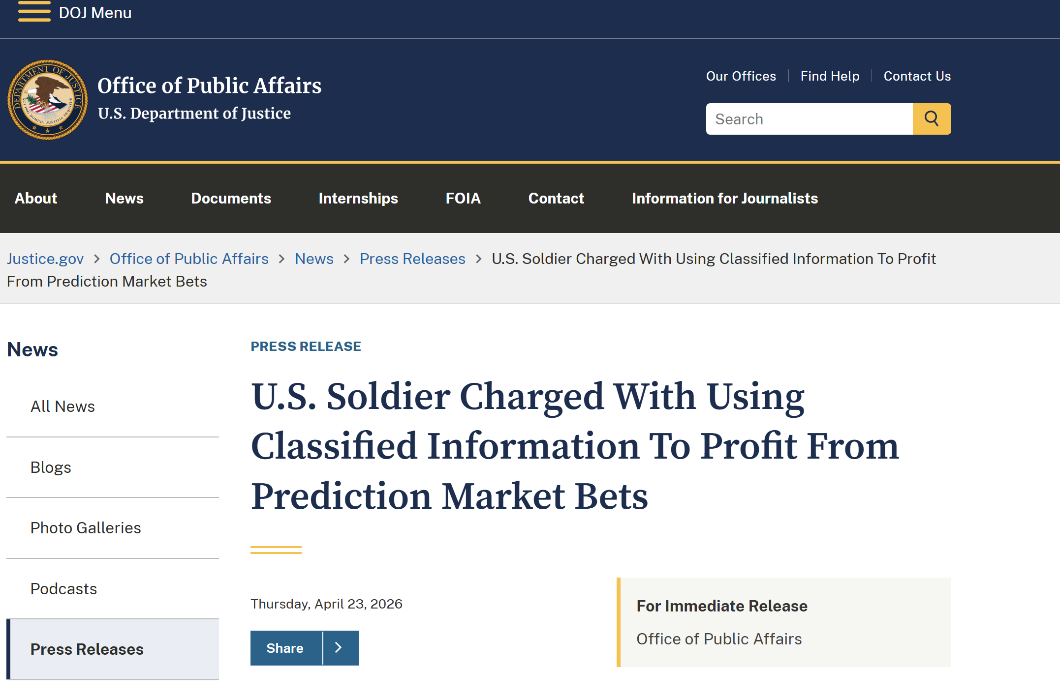 平台用户中不乏掌握政策信息的官员或高管——当某项决策在市场上价值百万美元时,「程序正义」如何对抗人性贪婪?2026 年 3 月,美国联邦检察官(南区)与 Polymarket 代表会面,探讨现有内幕交易法、反洗钱法及反欺诈法如何适用于预测市场。CFTC 同期发布指引,提醒平台履行限制内幕交易的责任。