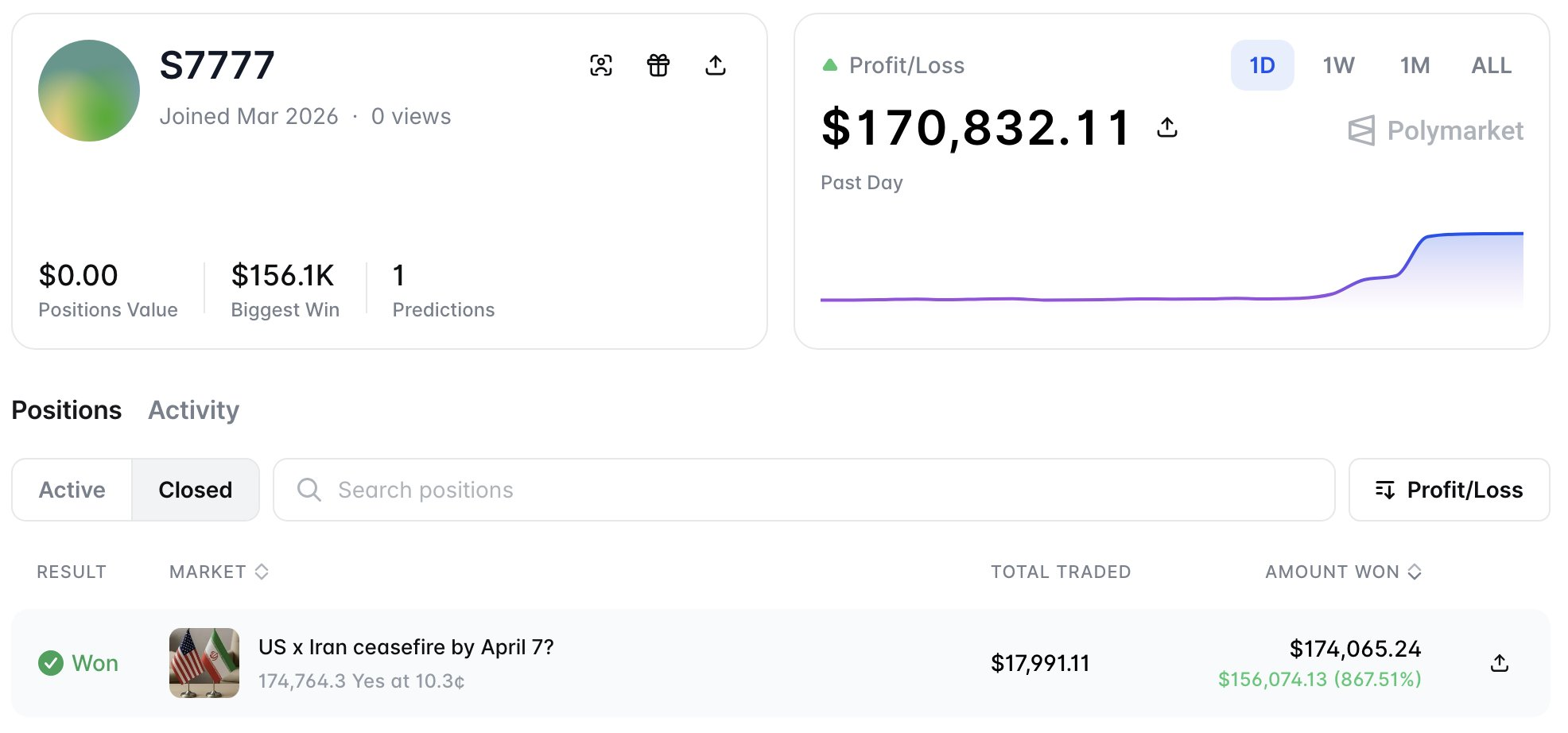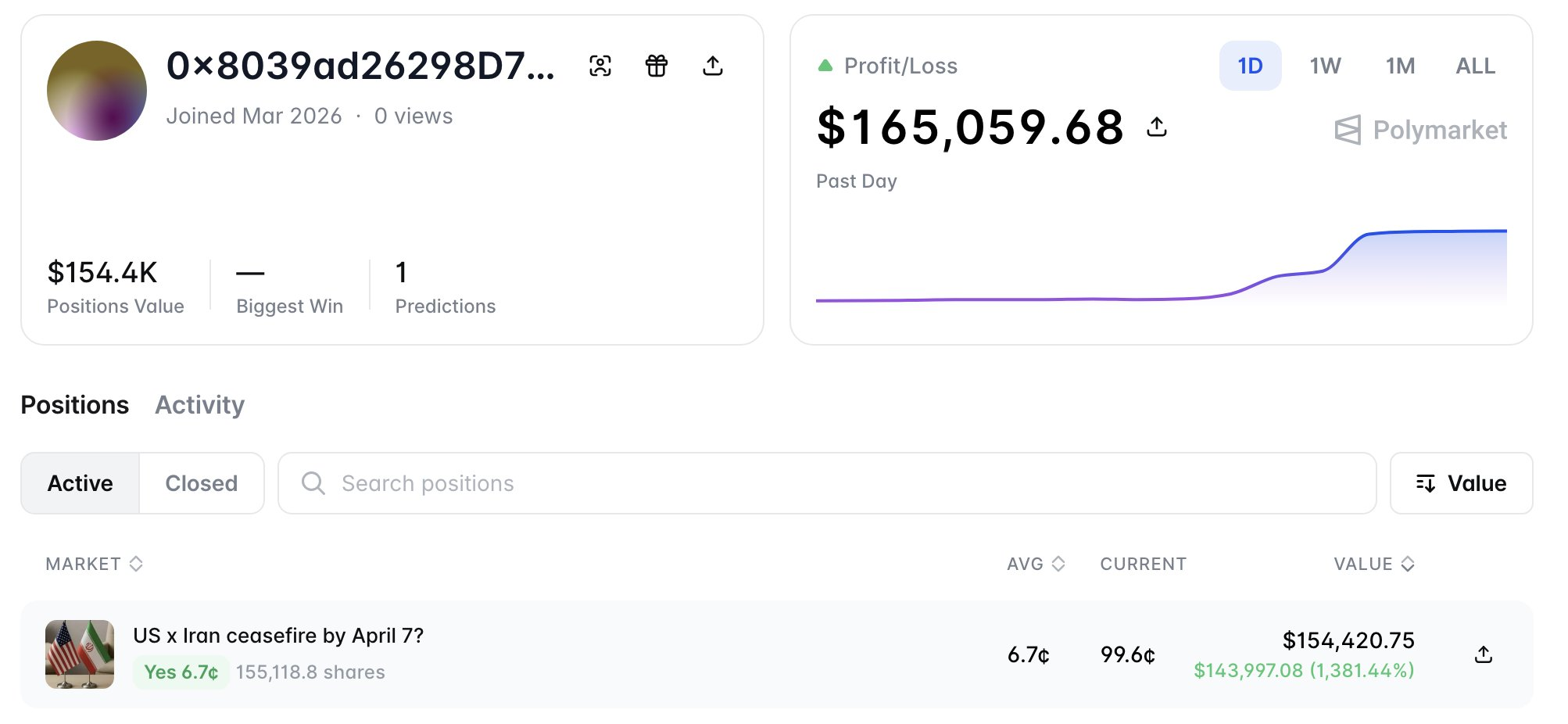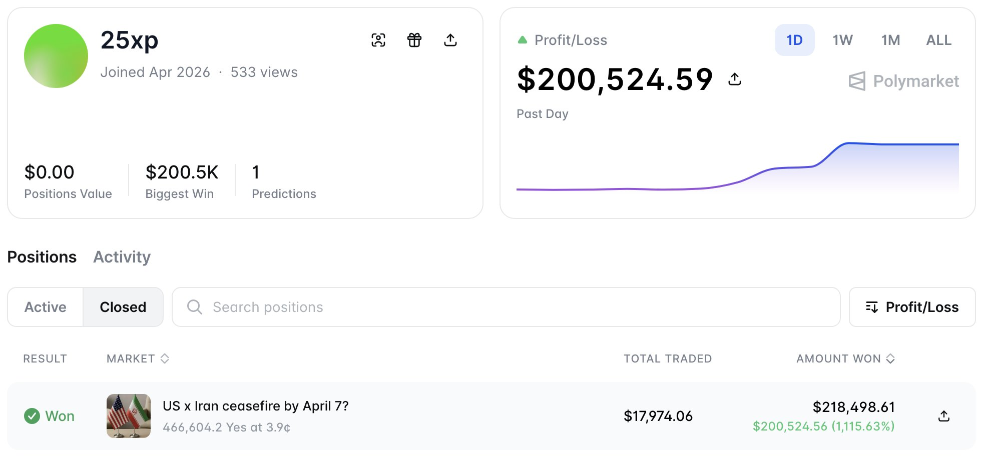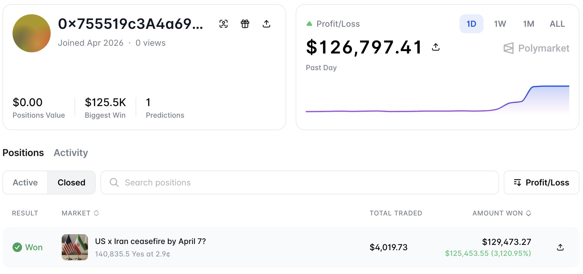 它们几乎全部在 4 月 7 日当天新创建,资金瞬间注入,随后以极低的 3.9% 赔率,精准重仓买入「4 月 7 日前停火」的 YES 选项。