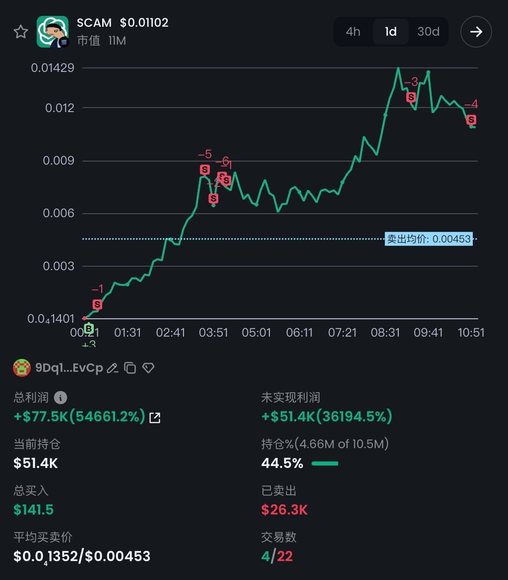 在接下来几个小时内,交易者通过以平均价格0.00453美元出售55.5%的头寸,锁定了约26,000美元的已实现利润。剩余持有的代币仍有超过51,000美元的未实现收益。