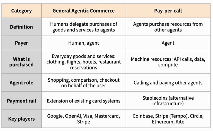 前者是较近的未来,后者是更远的未来。Agent 在用户指令下执行订单属于「通用 Agent 商业」(General Agentic Commerce),这一领域已在成型。Agent 之间直接支付则属于「按调用付费」(Pay-per-call),这是更遥远的未来状态。