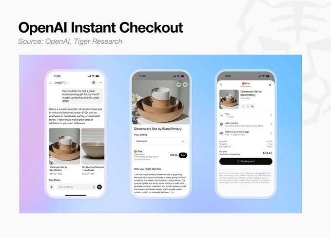 2025 年 9 月,OpenAI 推出 Instant Checkout,在 ChatGPT 内完成支付。对 Shopify 商户收取 4% 的交易费。然而,实时库存同步、税务处理基础设施缺失以及较低的转化率拖了后腿。