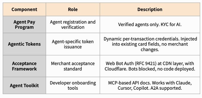 2025 年 4 月,Mastercard 推出 Mastercard Agent Pay,随后在 9 月发布开发者工具,10 月推出 Agent Pay Acceptance Framework,稳步构建其 Agent 支付系统。