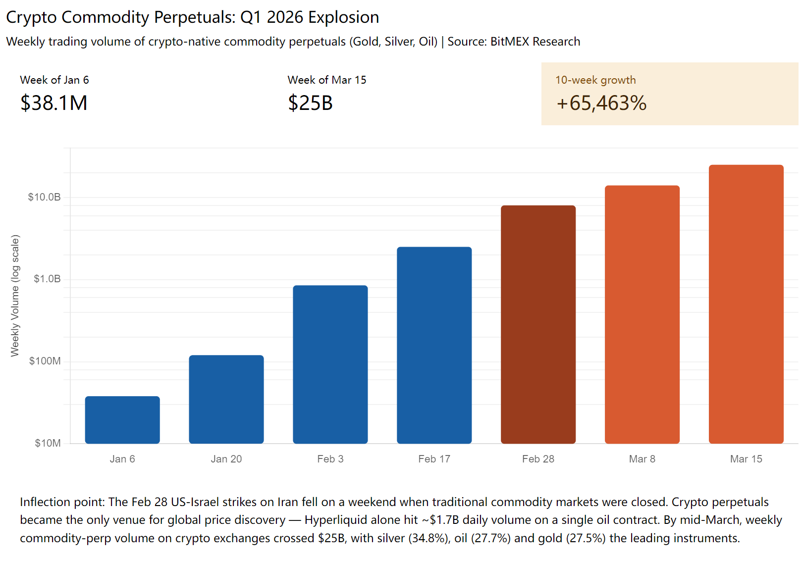 2026 年 Q1,加密交易所的商品类永续合约(黄金、白银、原油)周交易量从$38.1M 飙升至$25B,增长 65,463%。传统资产代币化将是 Crypto 接下来 5-10 年的主线,而 Pre-IPO 代币化,只是这股浪潮中,最新加入战场的一个品类。