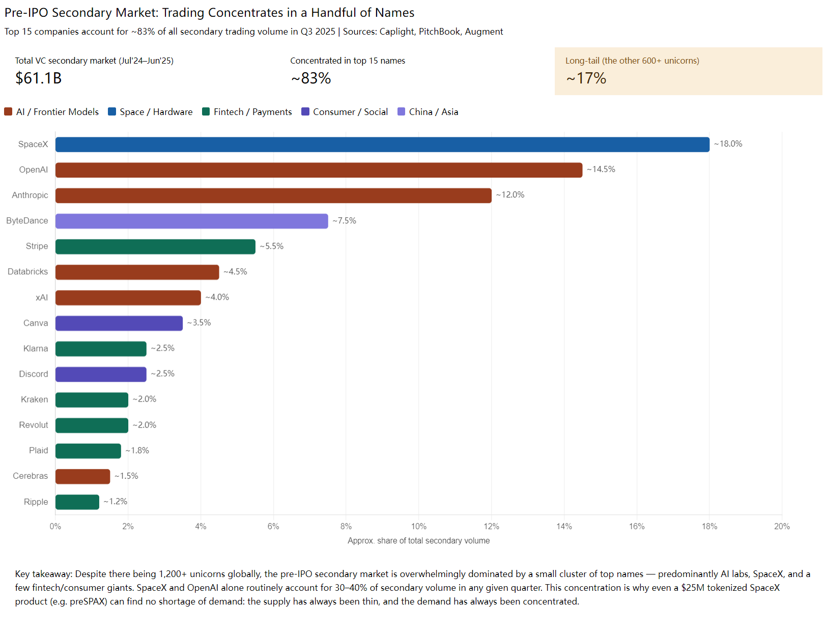 由于二级市场的交易高度集中在头部少数标的,SpaceX、OpenAI、Anthropic 等美国 AI/航天巨头长期占据交易量的 30-40%,加上字节、Stripe、Databricks、xAI 等头部独角兽,前 15 家就吃下了整个市场约 83%的成交量。(这种集中度也是为什么哪怕 Bitget/Gate 这次只发 SpaceX 代币、单单一家就能轻易超募过亿,头部 Pre-IPO 的供给一直很稀缺,需求很集中。)