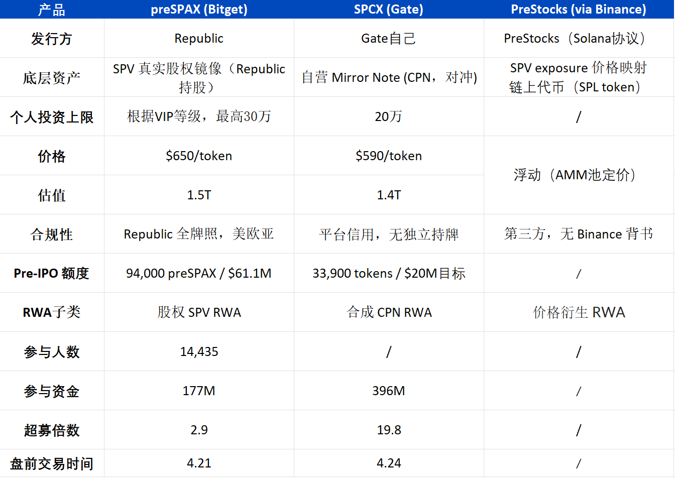 4 月,Bitget、Gate、Binance(PreStocks)三家头部交易所几乎同时上线了 SpaceX 相关的代币化产品。合规方式各有区别,但其本质都是,将过去仅面对超高净值客户的 pre-IPO 市场份额,拆成碎片卖给散户。