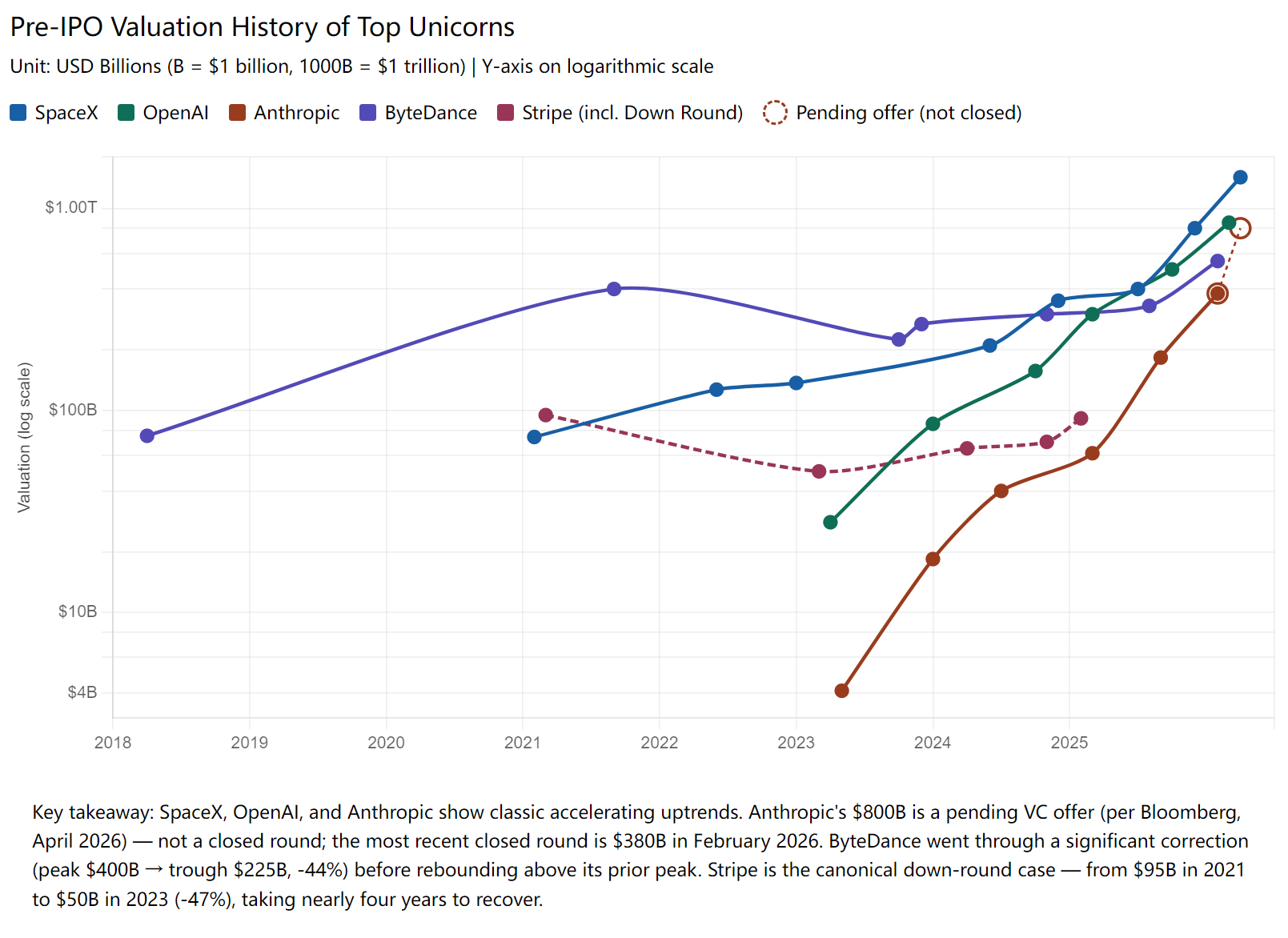 头部优质标的的融资估值通常单调上行。SpaceX 从 2021 年的$74B 涨到现在的$1.4T+,OpenAI 从$29B 涨到$852B+,Anthropic 从$4B 涨到$800B+,字节从$75B 涨到$600B+。每一轮新融资都在抬高估值,老股东随之水涨船高。
