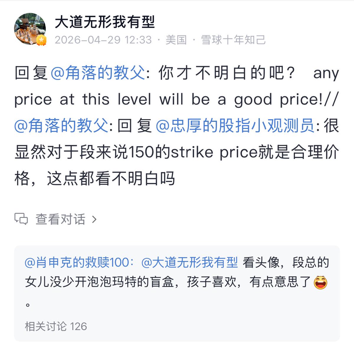 ⚡ 段永平把头像也换成泡泡玛特了,并且表示:any price at th­is le­v­el wi­ll be a go­od pr­i­ce!