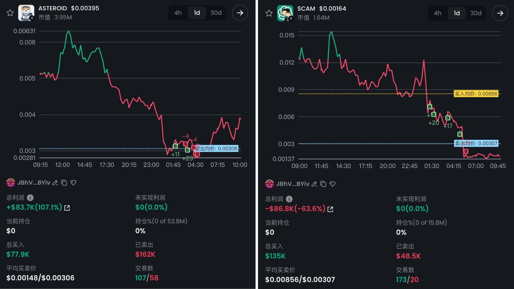 曾经是ASTEROID中的顶级鲸鱼,以MBYiv结尾的地址在退出盈利头寸并转向另一种高风险代币后失去了所有。该钱包在其最活跃时拥有5280万ASTEROID代币。该头寸在大约五小时前以$0.00306的价格关闭,此前以平均约$0.00148的价格建立。仅从这笔交易中实现的利润约为83,700美元,超过了初始投资的两倍。