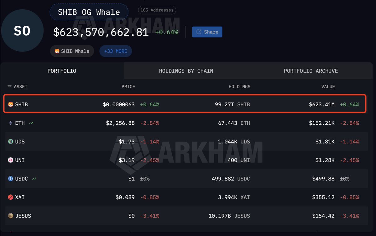 这位老玩家仅花费 $13,760 买入 103.33T $SHIB,过去几年内以 $37.6M 出售了 4.06T $SHIB,并仍持有 99.27T $SHIB($625.41M)——占总供应的 16.84%。