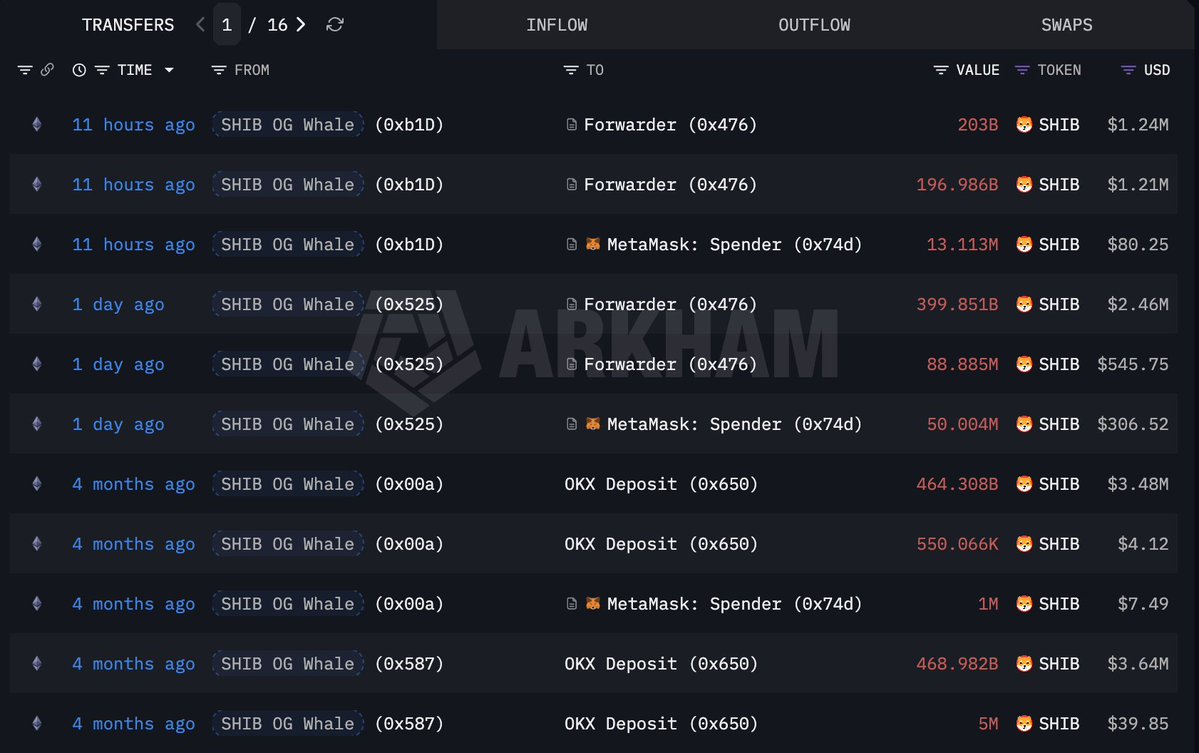 一位老玩家曾花费 $13,760 买入 103.33T $SHIB(在巅峰时价值 $8.9B),今天又出售了 800B $SHIB($4.9M)。