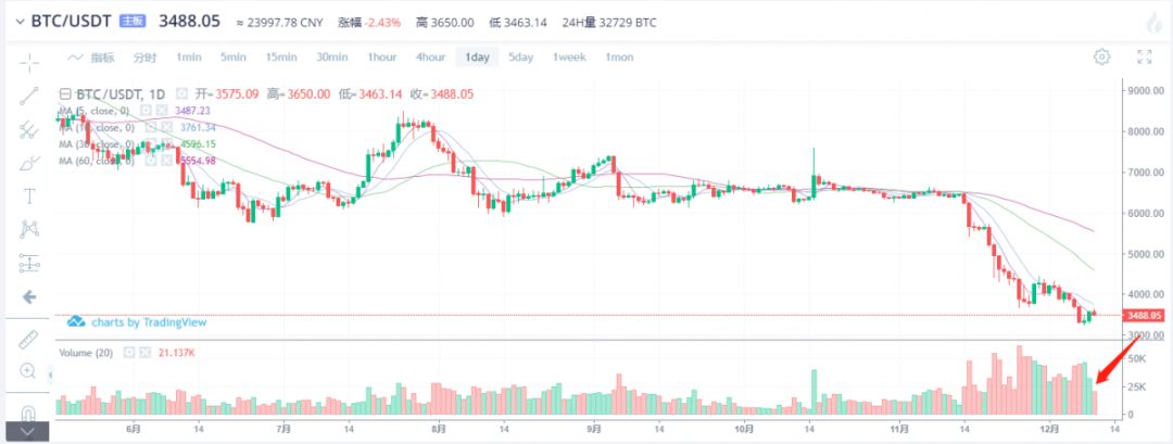 今天有媒体辟谣称前两天我们关注的超级大户钱包是coinbase整理的冷钱包地址,而非某个大户的实际买入行为,这个事情无从查证,目前也只是一种猜测罢了,无论是不是大户买入,狂人觉得都不太重要,因为从事实上来看,比特币已经跌到了临近底部的位置,距离真正的底部恐怕也就是一哆嗦的功夫了,但我们必须知道的是,没有一次超级大涨行情是通过V型反转走出来的,而都是通过漫长的盘整,在底部走出直线后才逐步走高,因此大家做好这种长期震荡的心理准备即可,大起大落会在本轮见底后逐步平静,后市将以长时间的窄幅震荡为主。