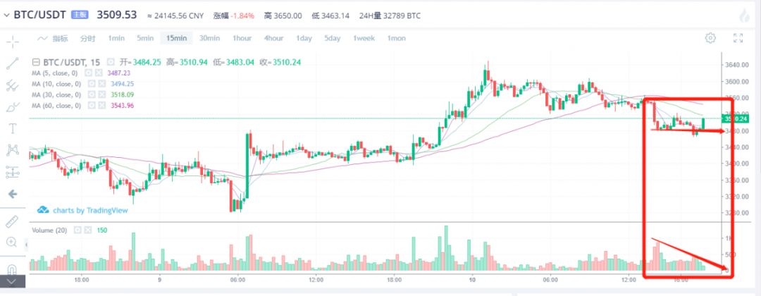 我们看下15分钟图,方块部分的走势其实很像目前比特币日线走势,即:出现了缩量的假突破行情,后来随着时间的推移被逐步收复,对于比特币这种假突破行为来说,往往后市都伴随着震荡向上,因此3500-3700这个区间成为了绝佳的震荡区间。