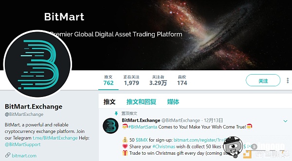 据TRON101了解,BitMart目前在推特拥有超过三万关注者。BitMart旨在提供币币交易、期货合约、融资融币、场外交易、全网交易,去中心化交易等多样化的系统功能,满足各类投资者的交易需求。目前,BitMart市场规模覆盖180多个国家,在全球拥有超过530,000名用户。 BitMart提供161交易对与一个最低交易费市场,并已开通信用卡/借记卡存款选项,计划在2018年底前提供全面的法定服务。
